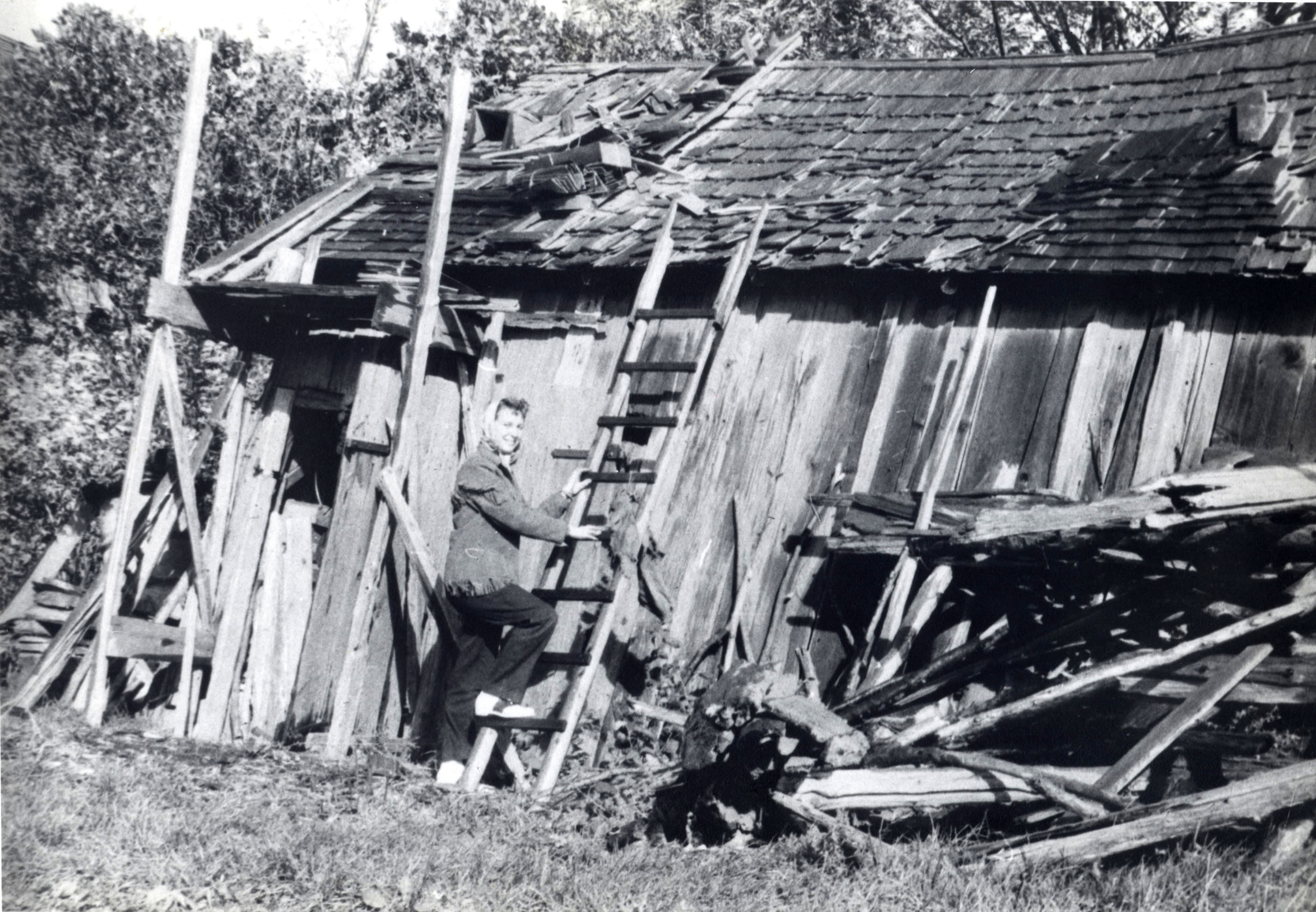 Picture was taken by Joan Marshall of the shed on David Jack's farm. Roofed with hand made cedar shingles. The lady in the picture is Jean Warrington.