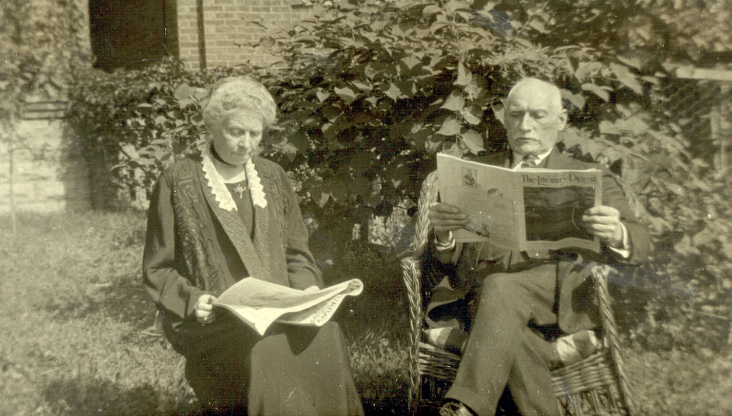 Reading the paper after their retirement. James Andrew Blain and Helen (Maconchy) were proprietors of the Gilford store from 1885-1919. James Blain emigrated from Castlewellan, County Down, Ireland, to Gilford about 1876 at age 25 and began clerking in this store, then owned by Squire Thomas Maconchy. In 1882 he married Maconchy's eldest daughter, Helen Amelia, and they moved into the apartment over the store. In 1885 he purchased the store and became postmaster, railway ticket agent, and telegrapher. He also operated a cheese factory, later a creamery, south of the Temperance Hall, and subsequently he donated that location as a community park. In 1919 the store was sold to Mr. and Mrs. Gordon Badger and the Blains retired to Glenholme Avenue in Toronto.