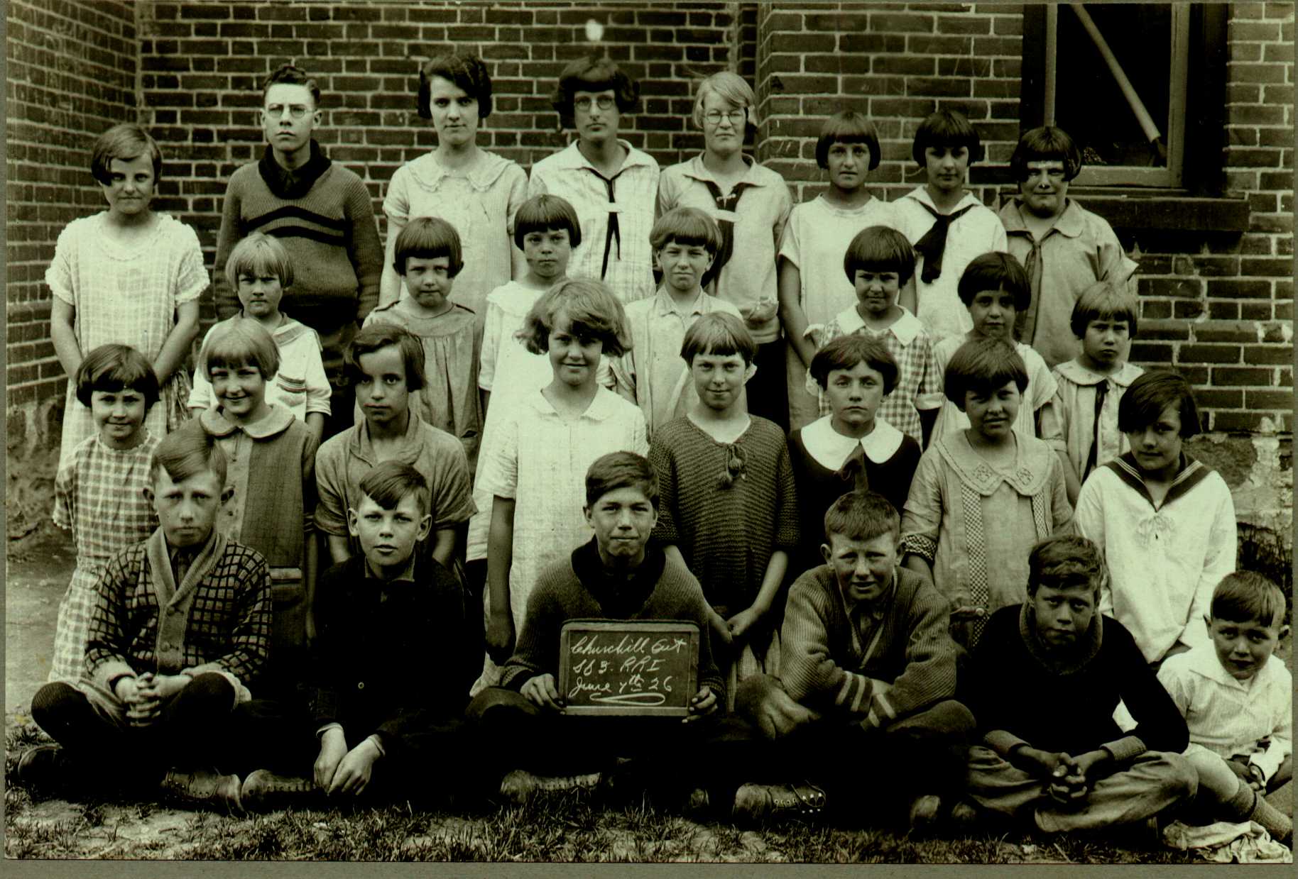 SS #3 Cherry Creek School. Back Row: Edna Selman, Clifton Kell, Miss Ruby Adams, *Evaleen Stewart, Norma Wilson, Sarah Wilson, Margaret McEwen, Bertha Stewart 2nd Row: Evelyn Lowry, Grace Allan, Marjorie Selman, Wilda Grose, Molly McEwan, Mary Morris, Ruth Hughes 3rd Row: Dora McEwen, Jessie Lowry, Mina Morris, Jean McEwen, Grace Selman, Maggie Grose, Gladys Clement, Marion Copeland Front Row: Ronald Allan, Temple Watt, Mansfield Harrison, Pat Boyes, Norman Harrison, Bob Wade *Name may be incorrect.