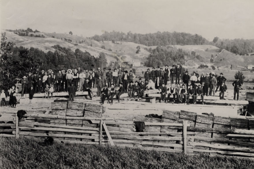 Photo of a large number of men standing on the site of a barn raising, posing for the photograph. The raising of a barn was a labour intensive task that required the use of many hands, so it often turned into a community event where neighbours would help build each other's barns. The date and location of this barn raising is unknown, but it does demonstrate that this was a predominantly male activity. Rolling hills are visible in the background, and the foundations of the barn or a fence are visible in the foreground.