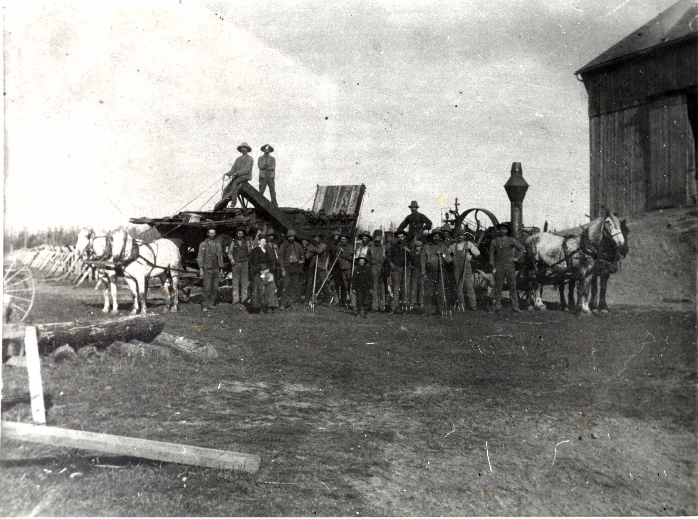 An early, horse-drawn, threshing outfit before steam thrasher were self-powered. It may be on Lot 19, Conc. 6 as another photo given by Mrs. Gordon Emrick is thought to be at that location.