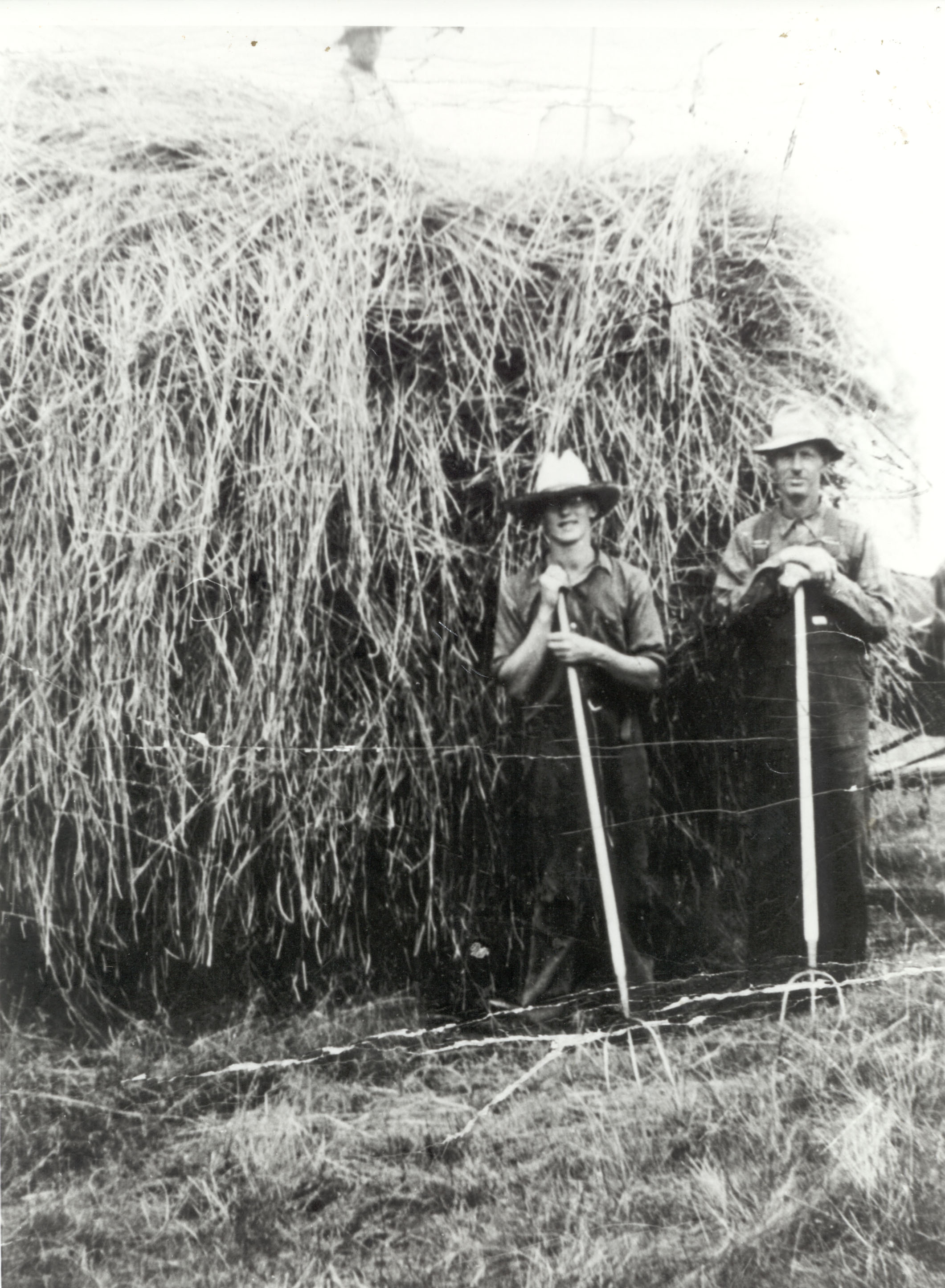 Haying at the farm of Harold Matchett. At this time loose hay was pitched with pitch forks onto hay wagons. Pictured are Elmer Moore (left), son of Laura Matchett, and Harold Matchett (right).
