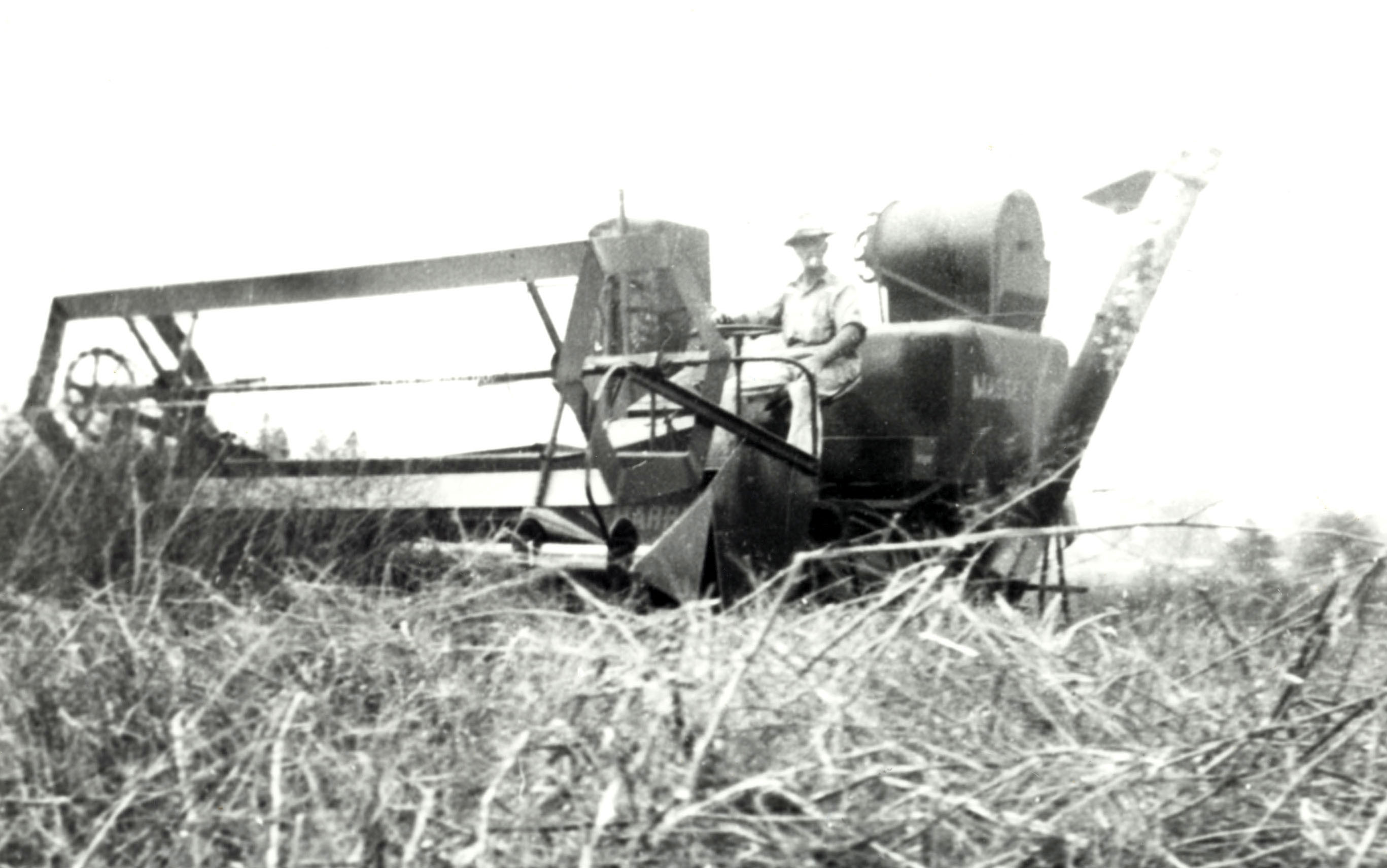 One of the first self-propelled combines in the Stroud community. The photo was taken on the Harold Wallace farm.