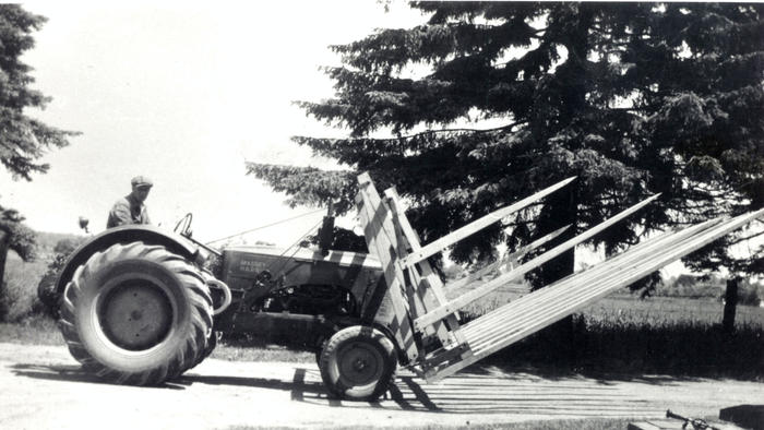 Photo of a buckrake in use on the Harold Wallace farm. Buckrakes were a type of hay rake designed to travel along a hay windrow and transport it to a hay stacker or baler.