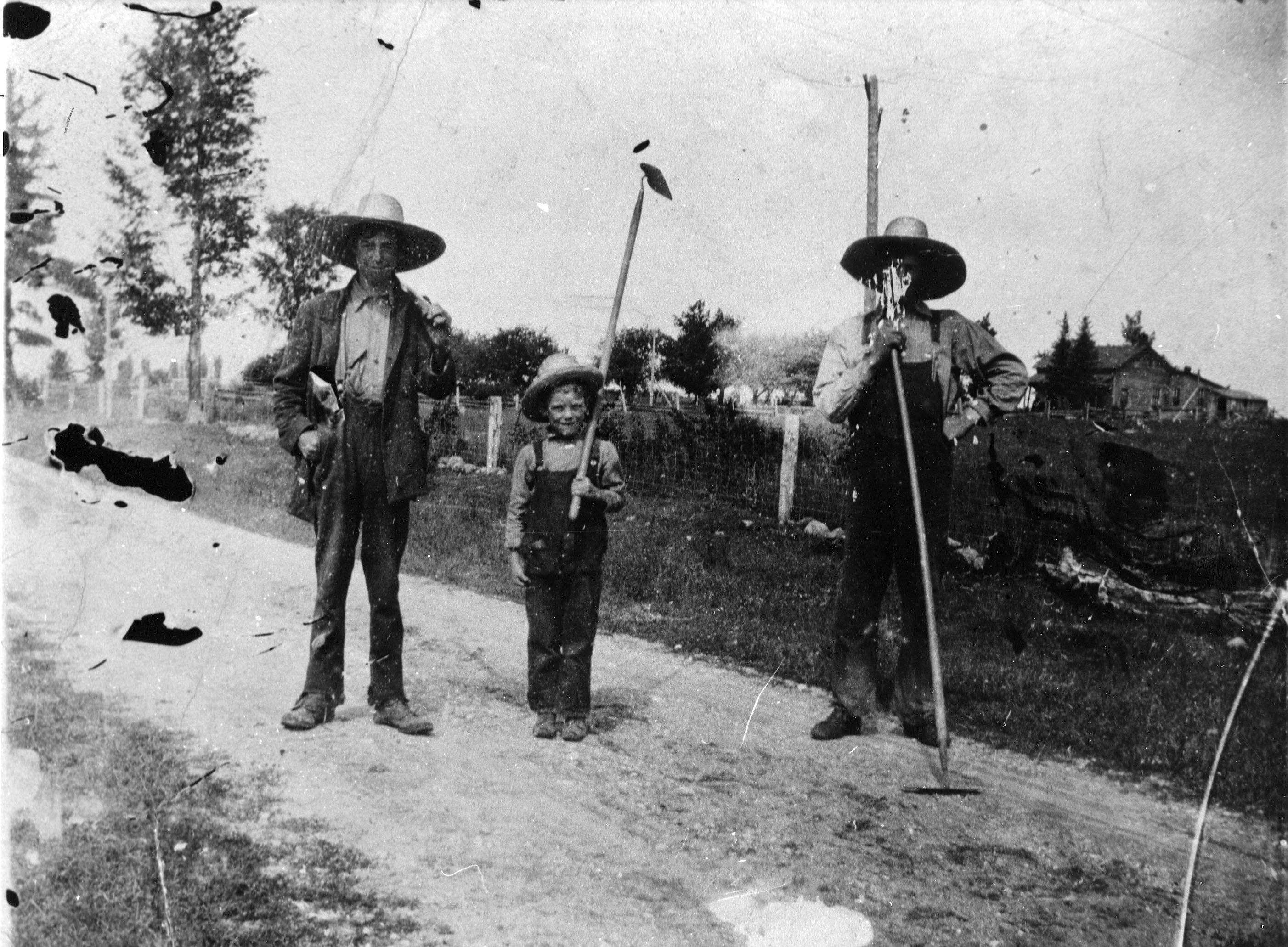 Pictured from left to right are Calvin Boyd, Edgar Thompson, and Bob (Robert) Thompson ready to work. Note how the 8th concession had not yet been paved.