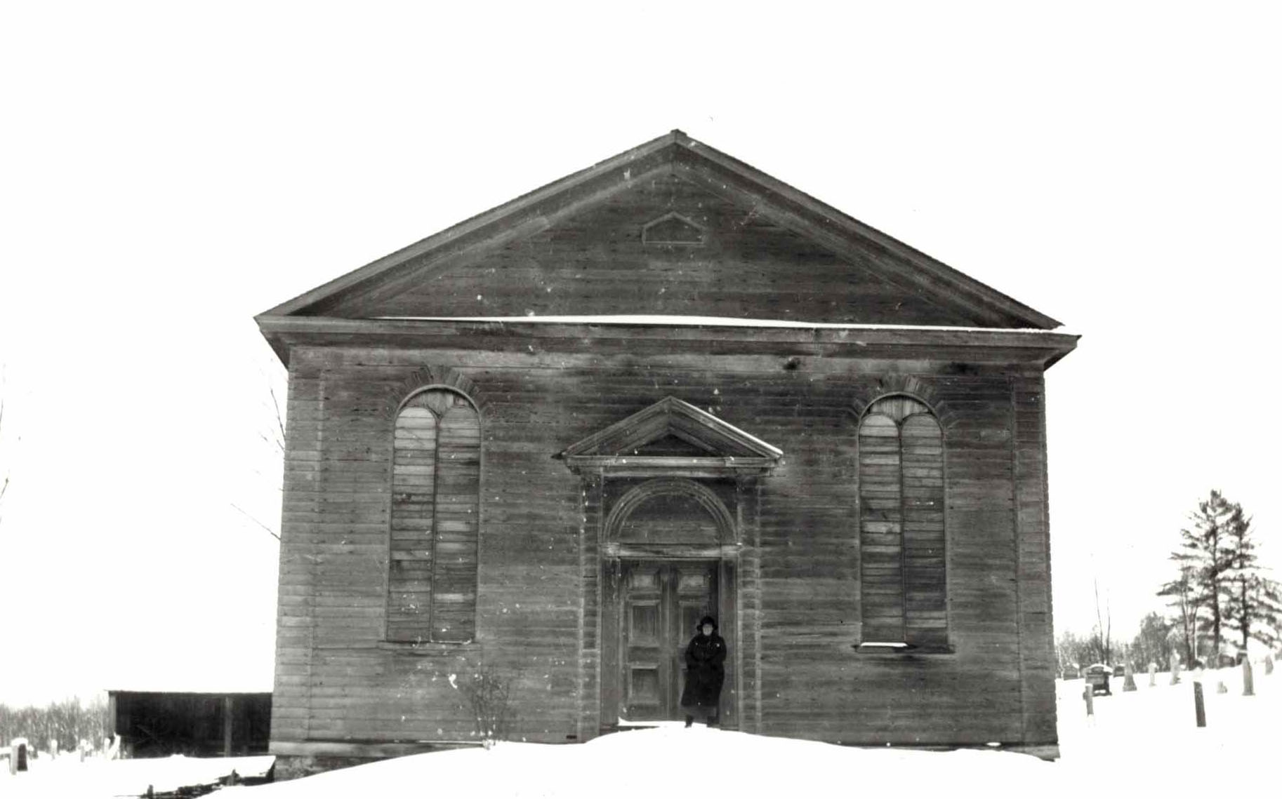 Photo of the Sixth Line Presbyterian Church that served a variety of areas in Innisfil. This building was torn down and moved across the lake to Sutton and rebuilt as a Presbyterian Church there. Before it was torn down Mrs. May Reive's grandfather James Reid was Superintendent of the Sunday School for some time. The image shows the front entrance of the wooden church, with two rounded-arch windows flanking either side of the door. A woman in a black coat and hat stands in the doorway, and a layer of snow covers the ground. According to the Innisfil Historical Review published 1951 (page 123) a log church was first built at the Sixth Line in 1844. In 1862 a new frame structure was built. The frame church was sold in 1927 before being moved.