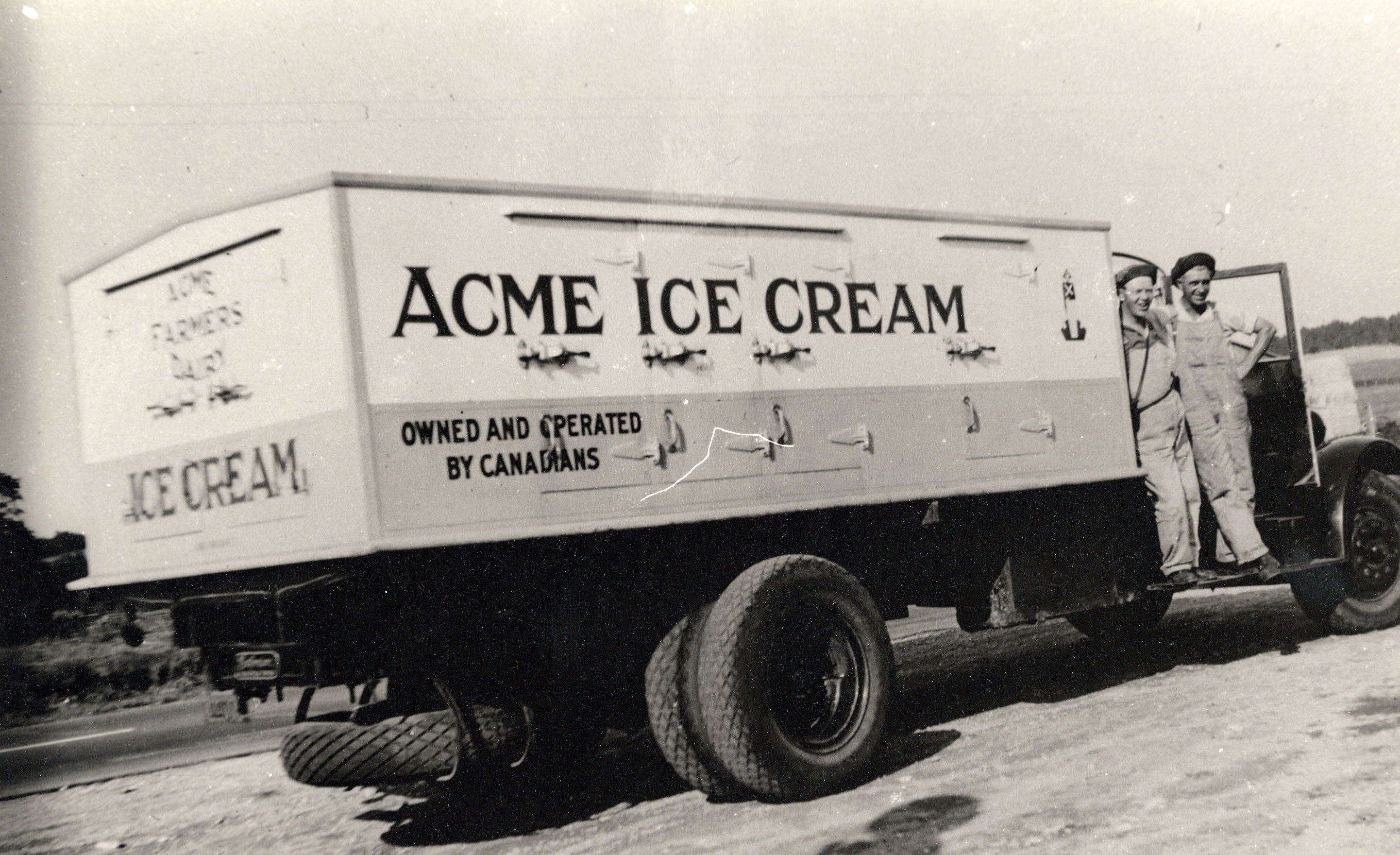 The Acme Ice Cream truck from Toronto delivered ice cream to the Stonecroft Motor Camp in milk-can like containers. The Imperial Oil Company brought hydro to Stonecroft from Barrie, and it was also one of the first locations to be serviced by Bell Telephone from Barrie. Pictured in this photo standing in the passenger side door are Jeff and Herb, the delivery men. The truck has double rear tires and the words "Acme Ice Cream" and "Owned and Operated by Canadians" painted on its side.