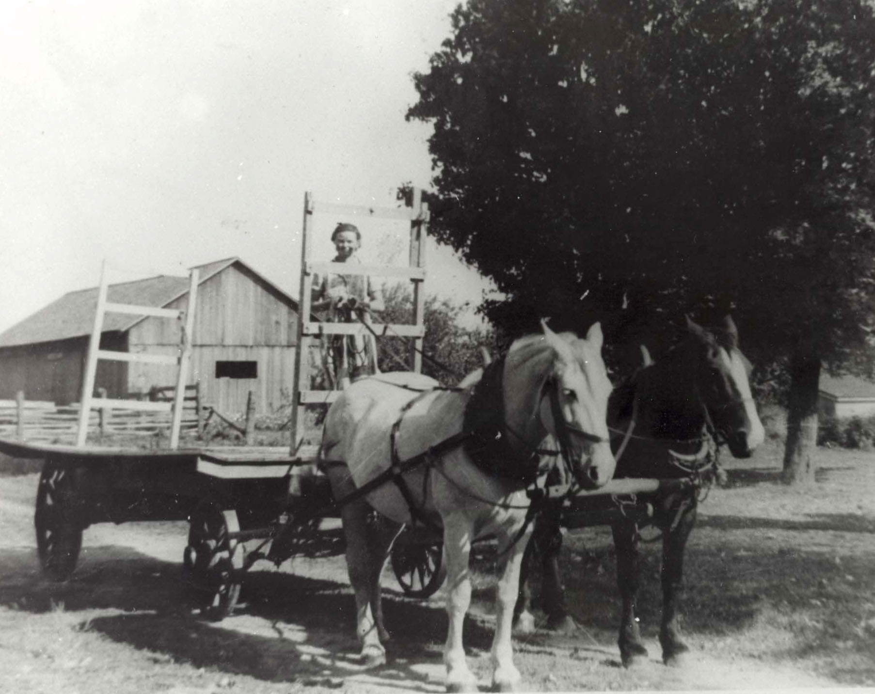 The team on a hay wagon on the Frank Hindle farm. Pictured on the wagon is Jean Hindle (Mrs. Hartley Evans).