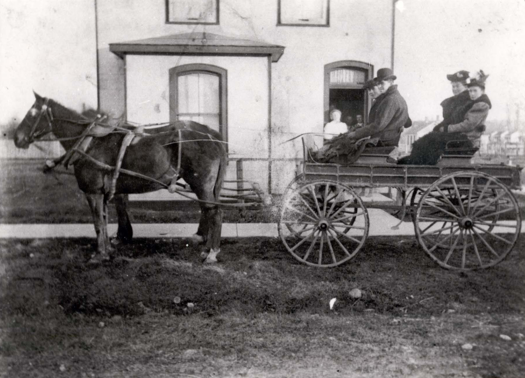 Photo showing a Democrat, which is a type of wagon, in Innisfil. The narrow white house in the background may have belonged to David Soules. Pictured on the Democrat are Mrs. John Soules and her daughter Pearl in the rear with Sam Warnica and Cecil Dodds, a teacher at Big Bay Point School, seated in the front. Martha Guest stands in the doorway. The wagon is large enough to require to two horses to pull it.