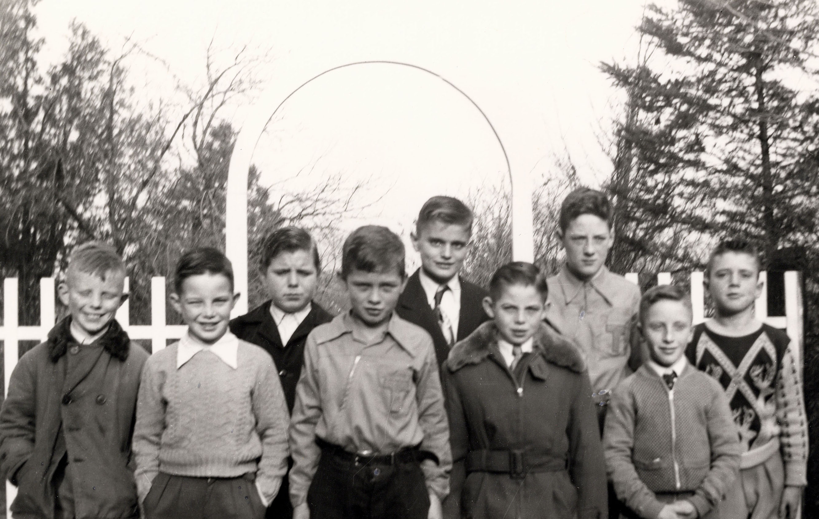 Photograph taken on the occasion of the St. James Centennial (1852-1952). Pictured from left to right are: Glenn Harris, Ross Campbell, Ted Dallimore, Joe Beleskey, John Goodfellow, Paul Campbell, Lawrence Cumming, Billy Harris, and Dale Webb.