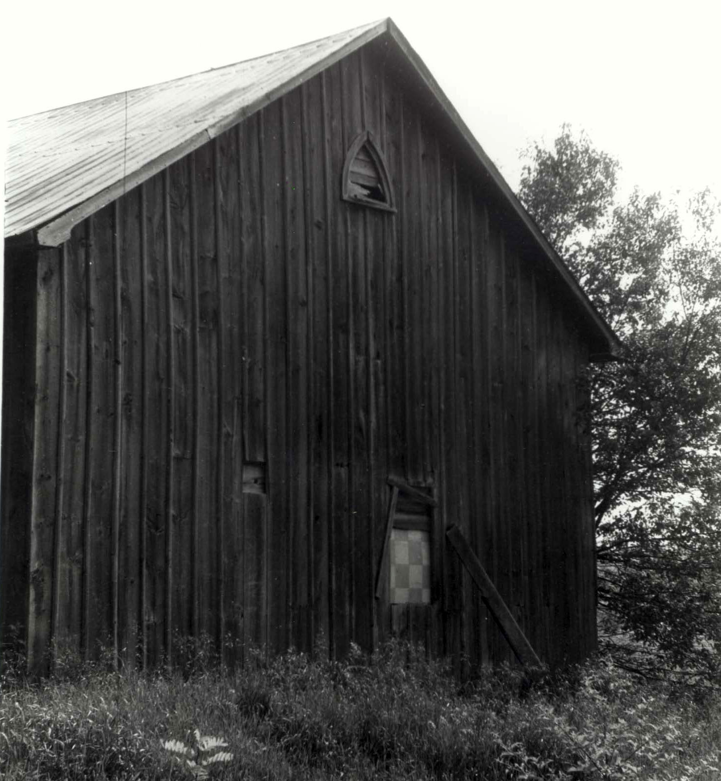 Photo of the first Anglican Church built at St. Paul's, likely constructed around 1851. It was later converted into a farm driving shed on George Stunden's farm NH Lot 12, Concession 11. Photo taken circa 1977.