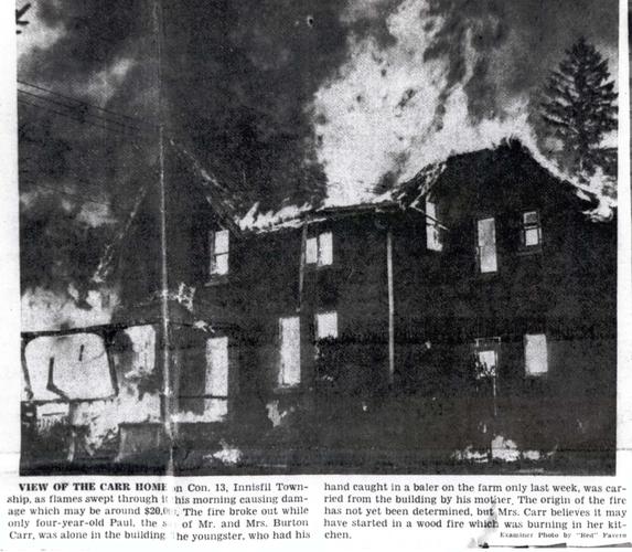 Newspaper clipping about the fire at the Edward Carr House, which was 100 years old. Burton Carr and his wife and son lived in the house at the time. The caption reads: "View of the Carr home on Con. 13, Innisfil Township, as flames swept through it this morning causing damage which may be around $20,000. The fire broke out while only four-year-old Paul, the son of Mr. and Mrs. Burton Carr, was alone in the building. The youngster, who had his hand caught in a baler on the farm only last week, was carried from the building by his mother. The origin of the fire has not yet been determined, but Mrs. Carr believes it may have started in a wood fire which was burning in her kitchen." - Examiner Photo by "Red" Favero