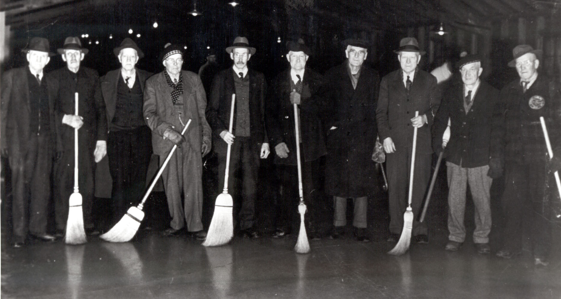 Group photo taken in 1947 of the curlers who participated in an Over 70 bonspiel in Stroud. The men are dressed in long dark coats and are standing side-by-side, with most wearing fedoras and a few holdings their brooms. Pictured from left to right are: Robert Sutherland, William Davies, Gilmour Reive, Mr. Meredith, Gavin C. Allan, Rev. Crayton, Thomas Simpson, Walter Allan, and Mr. William Smyth.