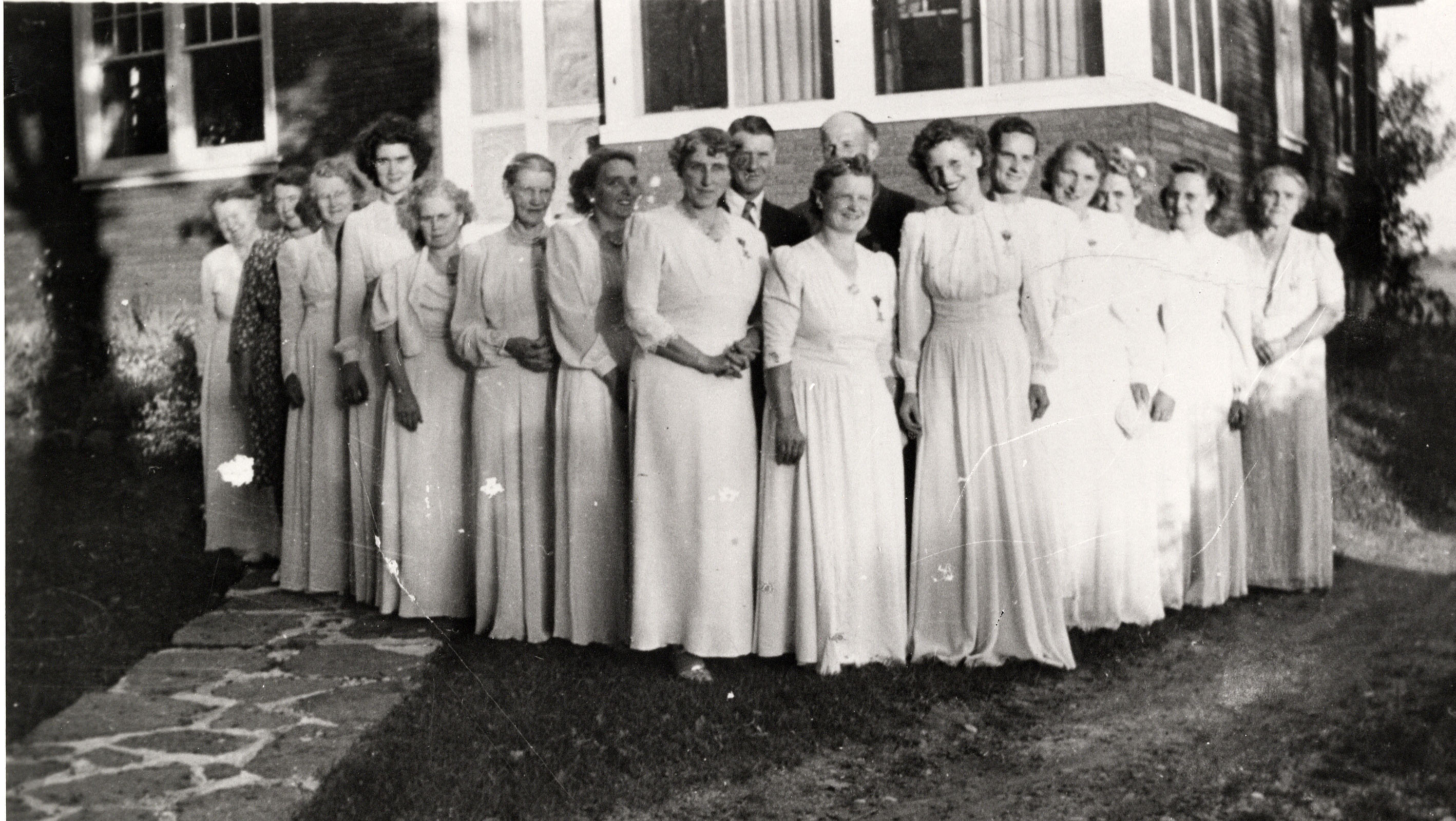 Group photograph of the Innisfil chapter of the Order of the Eastern Star in 1947. Pictured from left to right: Mrs. Jack Hunter, Mrs. Cliff Webb, Mrs. Blythe McConkey, Mrs. Jim Kennedy, Mrs. William Young, Mrs. W.J. Leonard, Mrs. Eric Jackson, Mrs. Garfield Gordon, Mrs. Charles Sproule, Mrs. Fred Mulholland, Mrs. William Hand, Mrs. Ted Webb, Mrs. John Cowan, Mrs. Mel Ayers, and Mrs. George Shering. Back row: Clifford Webb and W.W. Campbell. The ladies are all dressed in long white dresses, the men are in suits, and the photo was taken outdoors in front of a building.