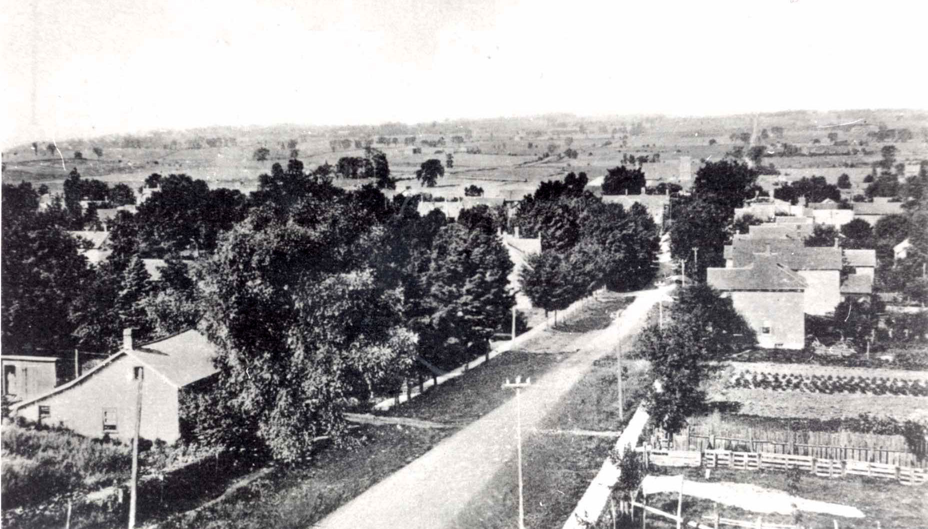 An aerial view of Cookstown looking down on Church Street, and west from the tower of St. John's Anglican Church. This photo was taken by Thomas "Tommy" Monkman.