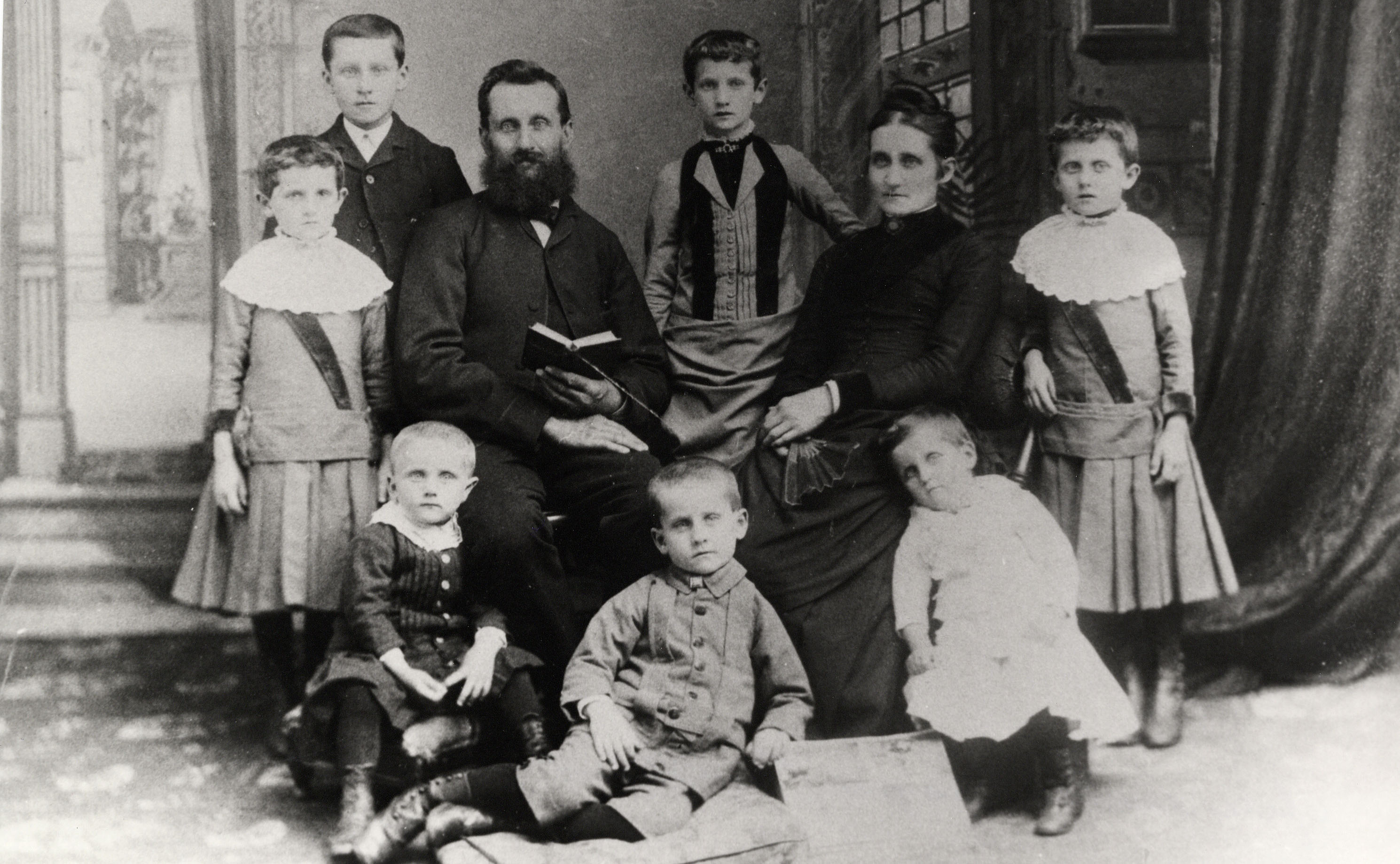 Portrait of Matthew Cooper Jr., his wife Maria Dutcher, and their family. Pictured from left to right: Front Row: Joseph (1884-?), Edward (1882-1903), and Emma (1884-?). Back Row: Ethel (1880-1976), Howard (1874-1964), Matthew Cooper (1842-1928), Florence (1876-1946), Maria (née Dutcher, 1849-1906), Eva (1880-1972). There were two sets of twins in this family: Ethel and Eva Joe and Emma