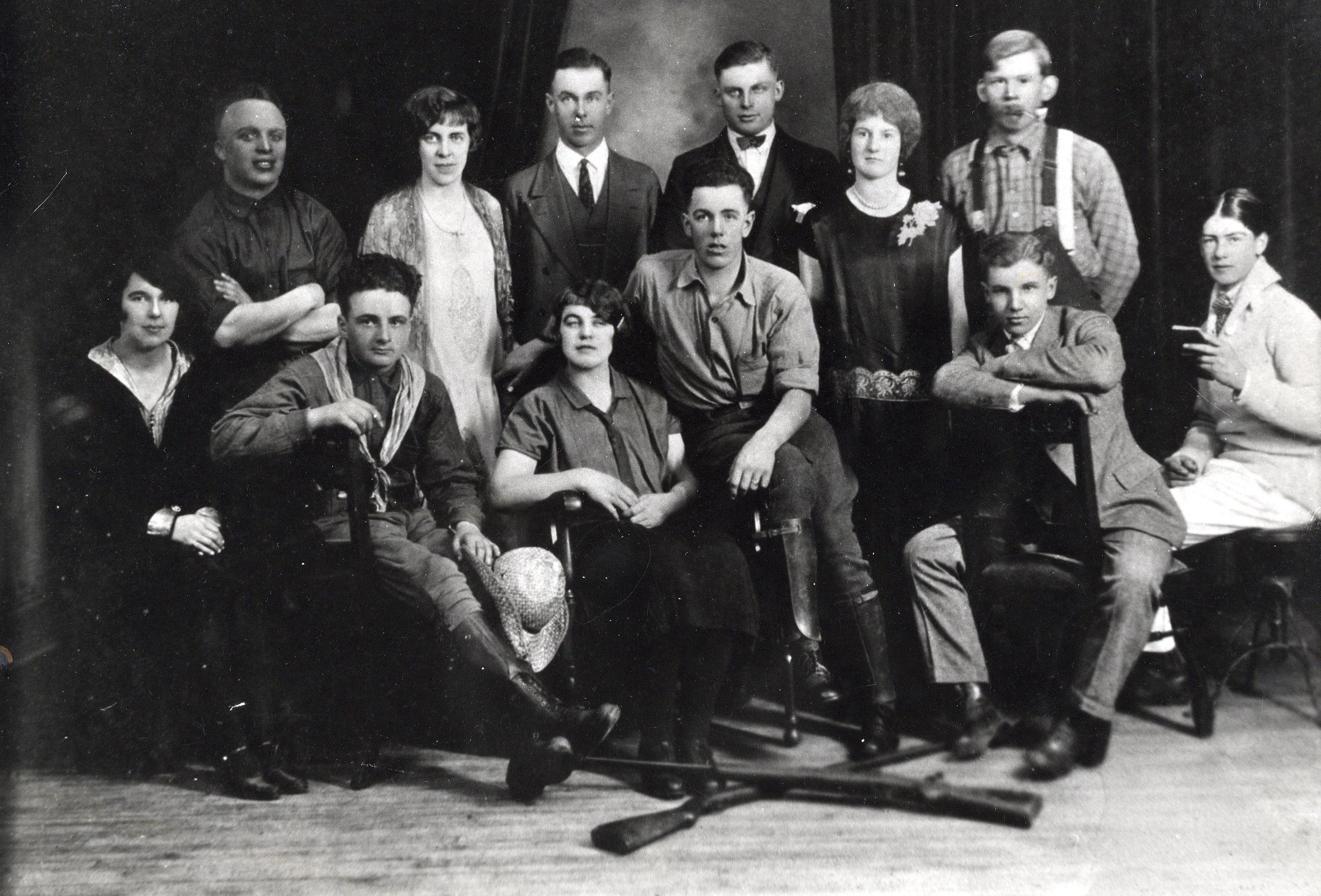 Photo of the members of a church Young People's Society in costume for a play called "Prairie Rose." Pictured from left to right - Front Row: Margery Black, Bruce Wice, Mary Reid, Edgar Thompson, Obrey Scythes, and Milton Ferris. Back Row: Ward Goodfellow, unknown, Ray Abernathy, Elmer Black, Arnold Reid, Ruby Wice (later Mrs. Joe Cochrane), and Edward Marquis.