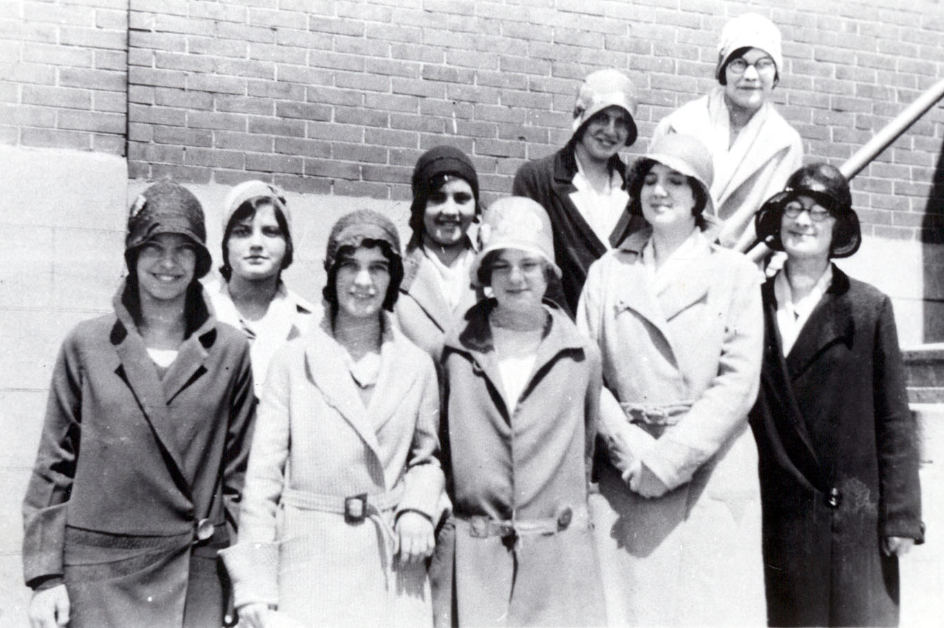 Pictured from left to right - Front Row: Geraldine Small, Olive Broley, Kathleen Hughes, Florence Robertson, and Miss. Carrie Metcalfe. Back Row: Isobel Shering, Norma Scythes, Mae Ferguson, and Edith Nellands.