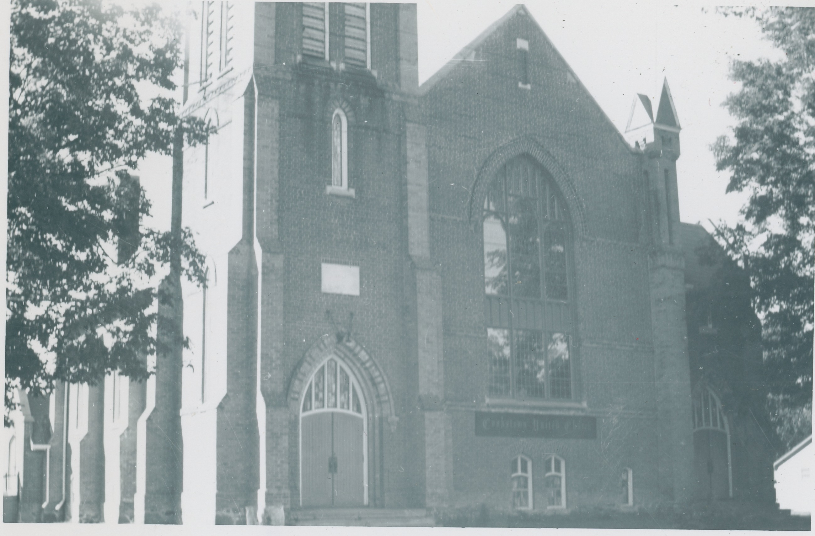 Photo of the exterior of Cookstown United Church. Originally the Cookstown Methodist Church, it was built in 1878, destroyed by fire in 1914, and rebuilt in 1915. After the church union between the Methodist Congregational and Presbyterian churches in 1925 it became the Cookstown United Church. This photo showing the front entrance and large front window was likely taken after 1925.
