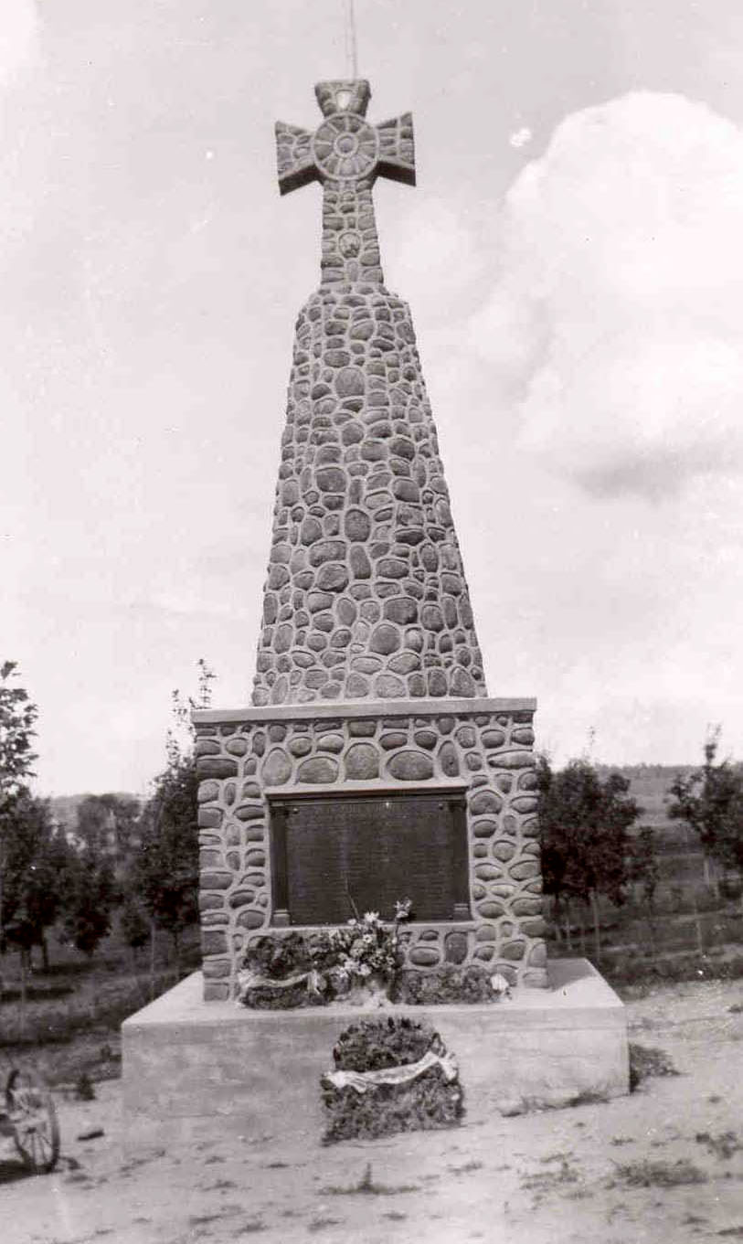 Photo of the Cookstown cenotaph located beside St. John's Anglican Church and in front of the Cookstown branch of the Innisfil Public Library. The centotaph is a small tower constructed of field stones with a cross at the top, and a plaque at the base bearing the names of Cookstown soldiers who died in the first and second World Wars. It was built in 1917 as a memorial to the Cookstown area men who served in the first World War, and one maple tree was planted in the lot behind the memorial for each man who served for a total of 65 trees. The park was then named Veterans Memorial Park.