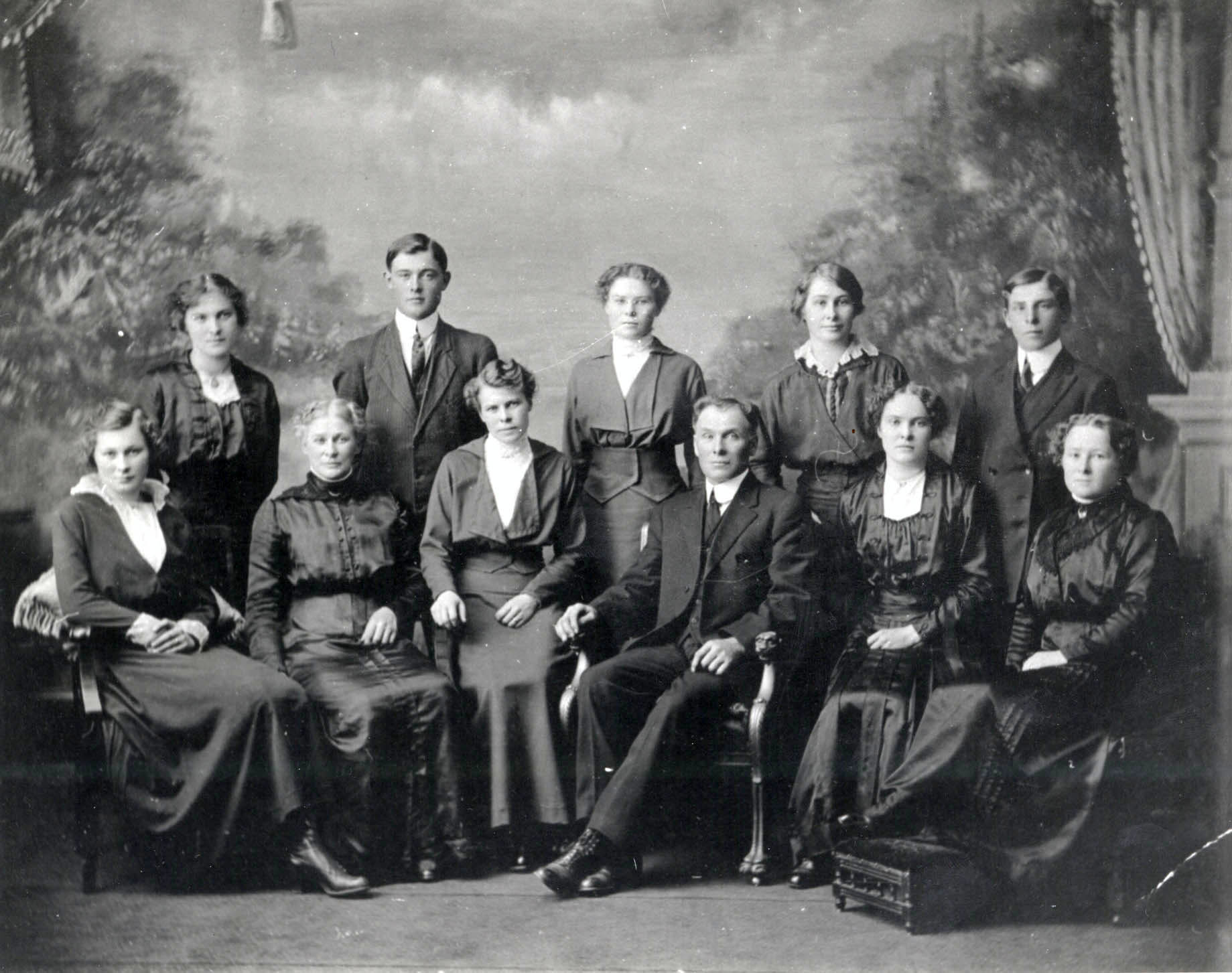 Portrait of William Guest (1857-1932) and his wife, Elizabeth Guest (née Nightingale, 1865-1931) and their family. Pictured from left to right - Back Row: Nell, Oliver, Eva, Gertrude, and Gordon. Front Row: Lila, Mrs. Elizabeth Guest, Maggie, Mr. William Guest, Lula, and Mabel.