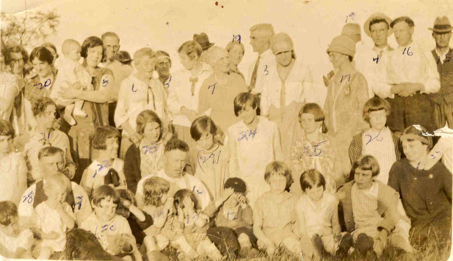 Group photo taken during a Cookstown United Church Picnic in the 1920s. The photo has since been hand labelled by a pen with numbers to identify certain individuals, though much of the ink has worn away. Pictured are: (1) Marion Webb (2) Mrs. Elva Leadley (3) Harry Leadley (4) Tom Webb (5) Evelyn Leadley (6) Mrs. Millicent Baker (7) Mrs. Margaret Arnold (8) Mabel Chantler (9) Leonard Ross (10) Arthur Kidd (11) Mrs. WJ Broley (12) Jack Kidd (13) Joan Kidd (14) Betty Kidd (15) George Baker (16) William Clement (17) Mrs. Clement (18) Mr. E Ley (19) Mrs. E Ley (20) Mrs. Evelyn Arnold (21) Hazel Ley (22) Marion Webb (23) Grace Robertson (24) Laura Ley (25) Ruth Roberston (26) Doris Dunning (27) Mrs. Olive Broley (28) Leonard Ross (29) Jean Baker and (30) Fay Dunning.