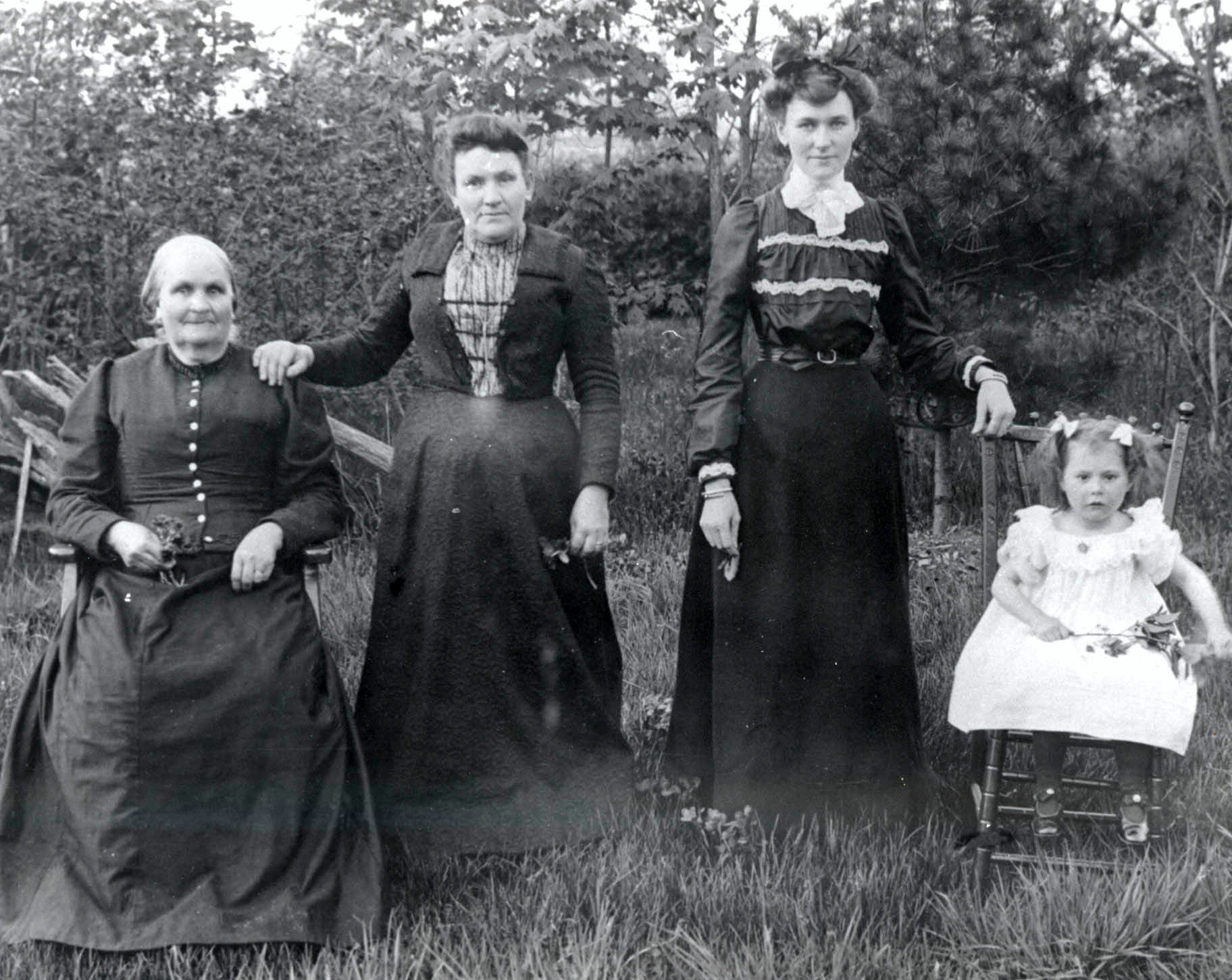 Black and white photo of four generations of Gordon women. Pictured from left to right: Emma Plowman (née Walker, great-grandmother of Mrs. Lloyd Webb), Jane Gordon (née Clapham, grandmother of Mrs. Lloyd Webb), Amelia Simpson (née Gordon, aunt of Mrs. Lloyd Webb), and her daughter Mae Senton (née Simpson).
