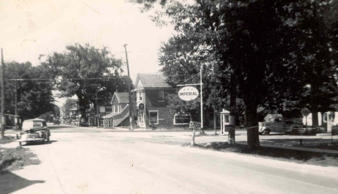 Photo of the intersection of Highway 27 (King St.) and Highway 89 (Queen St.) looking West in Cookstown, taken in January 1964.