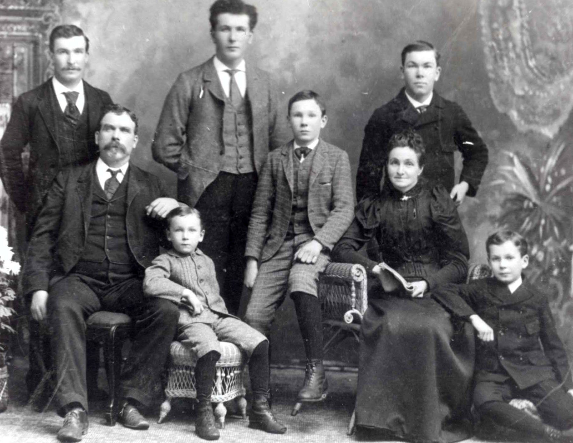 Portrait of the family of James Fitten Guest (1852-1912), who farmed at Big Bay Point (Lot 23, Conc. l3 - a string hundred acres). Pictured from left to right - Back Row: Louis (l876-l934), Bert (1878-1938), and Fred (1880-1925). Front Row: James Fitten Guest, Dolph, Harvey (1883-1957), Mrs. Hannah Guest (née Greaves, 1857-1921), and Algie (?-1926).