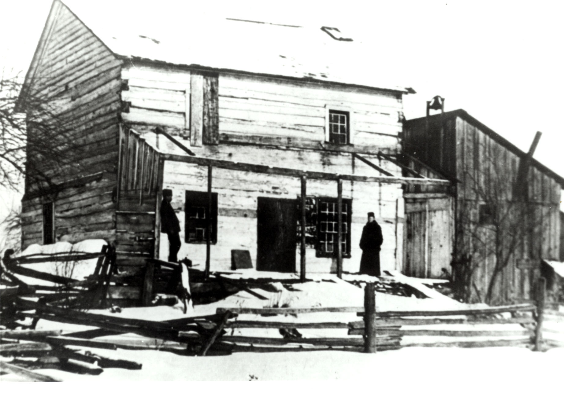 Photo of a two-storey log house built about 1845 and taken just prior to being demolished in 1906. In the picture are Mrs. William Ralston (née Mary King) and Mr. Robert Stewart. Mrs. Ralston lived in the house with her parents from 1868 to 1883.