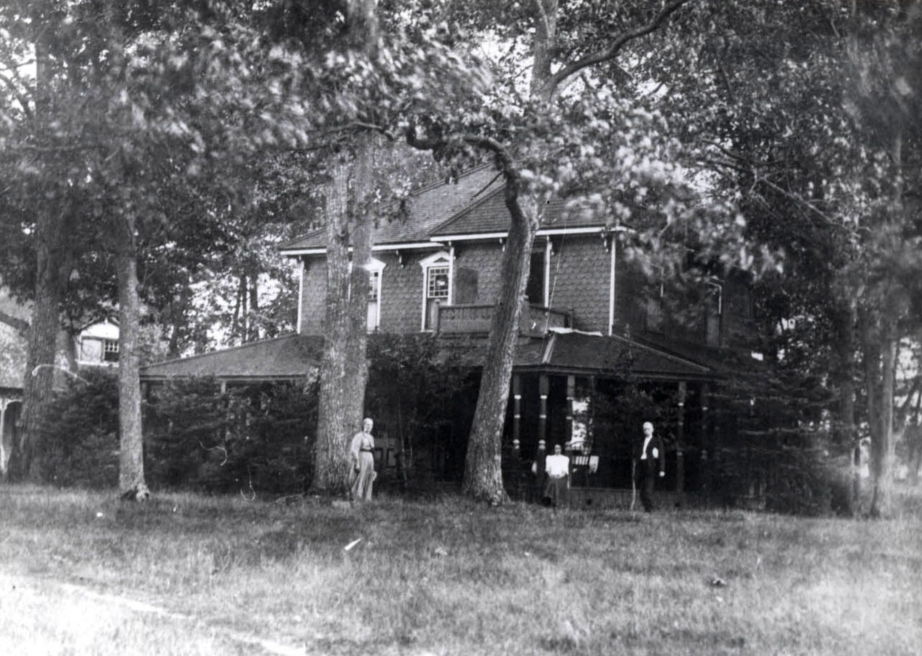 Photo of the McKeggie house at De Grassi Point, c. 1905. It is a two-storey house surrounded by trees with a wraparound verandah and a small balcony on the verandah's roof. Pictured are Mrs. McKeggie, Manon McKeggie, and J.E. McKeggie standing on the lawn in front of the house.