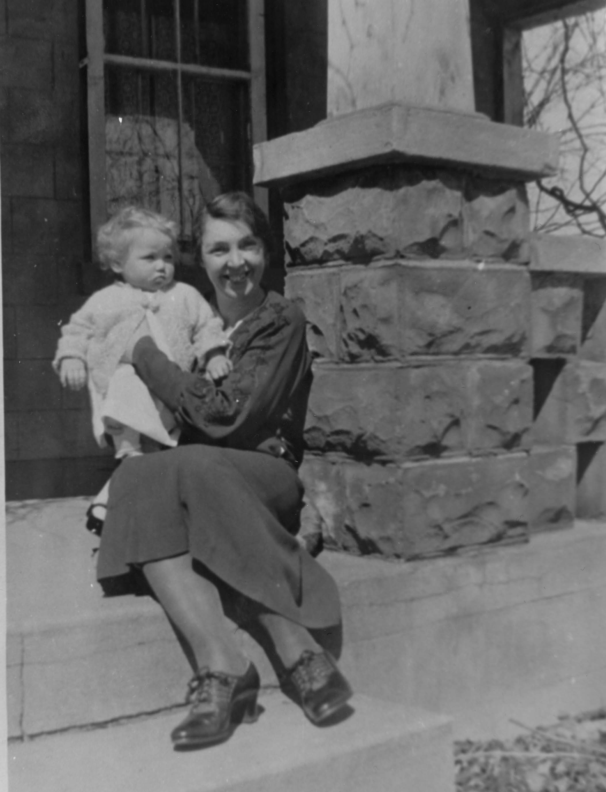 Photo of Frances M. Hubbert in a long dress on a porch step holding with her infant Noriene Hastings of Beaverlodge, Alberta. The photograph was taken at 189 Essa Road. Ms. Hubbert was a teacher, missionary, and writer born in 1900 at Holly as the seventh child of James Hubbert and Martha Srigley. She graduated as a Deaconess of the Anglican Church in 1929 and was best known as a Friendship Worker for the Anglican Women's Auxiliary (1950-65) and welcomed hundreds of European immigrant families to Toronto after the war in the name of the Church. She found homes, jobs, and arranged classes in English for them, often teaching them herself. In 1964 she alone resettled 145 families and held 474 interviews. From 1933 to 1973 she wrote poems and stories for children, a countless number were published, mainly in Anglican Sunday School papers, "Child's Own." Her "Twilight Hour" (1959) was published in public school reader "Across the Country," "God the Father Hears Today" (1962) was published in the Anglican Hymn Book for Children, "Cradles in a Manger" (1965) was chosen for a new hymn book by the Hymn Society of America and was one of twelve accepted from 400 entries. From 1965 to 1973 she was the Literature Secretary for the national office of the WCTU.