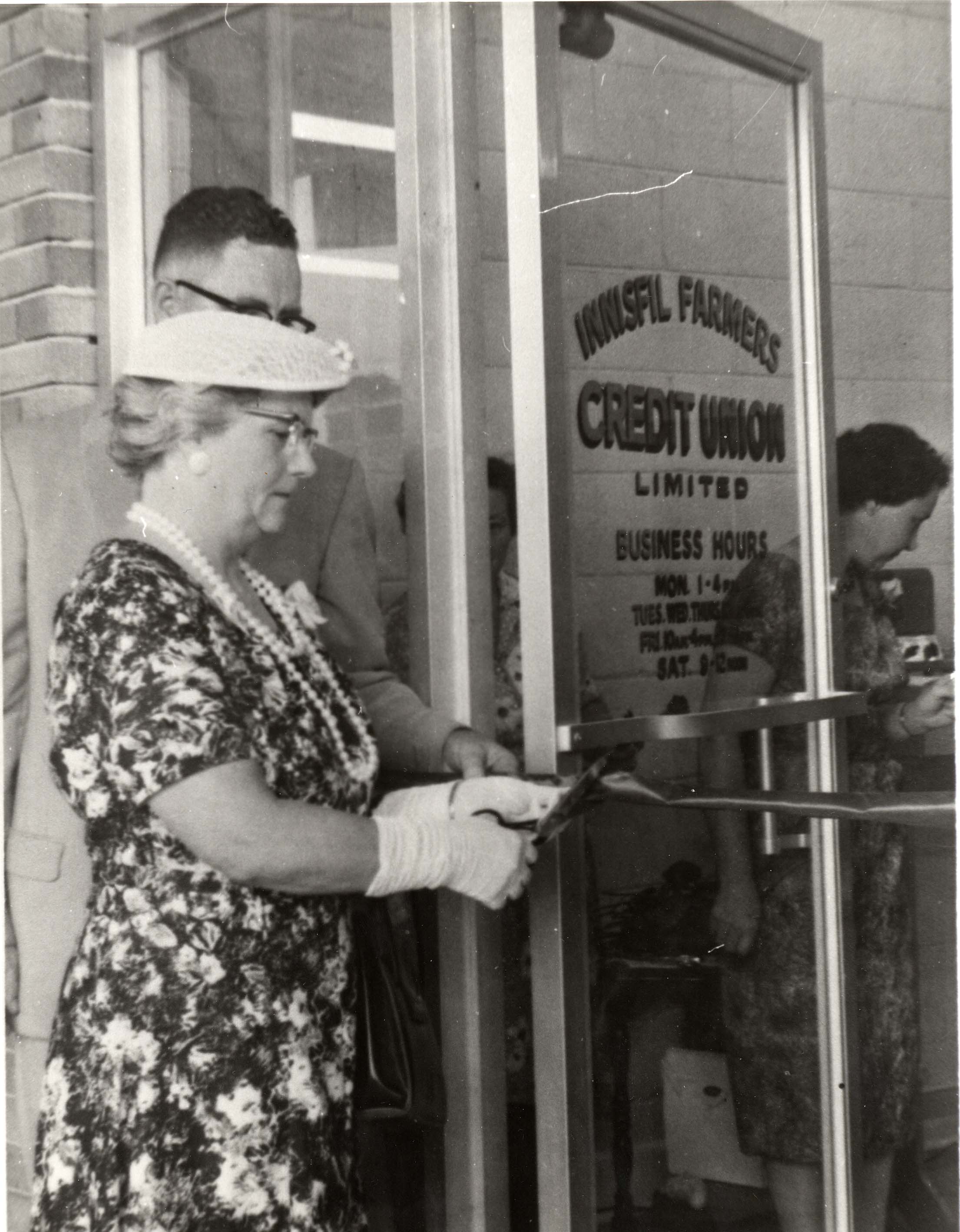 Photo of Lottie Cowan (wife of Bruce Cowan) wearing a floral dress, white gloves, and a hat cutting the ribbon at the first office of the Innisfil Farmers' Credit Union, located in Young's Plaza, Stroud. Bruce Cowan was the first President of the Credit Union. Pictured in the back left is Lloyd Cumming (manager) and to the right, Mrs. Keith Constable (employee).