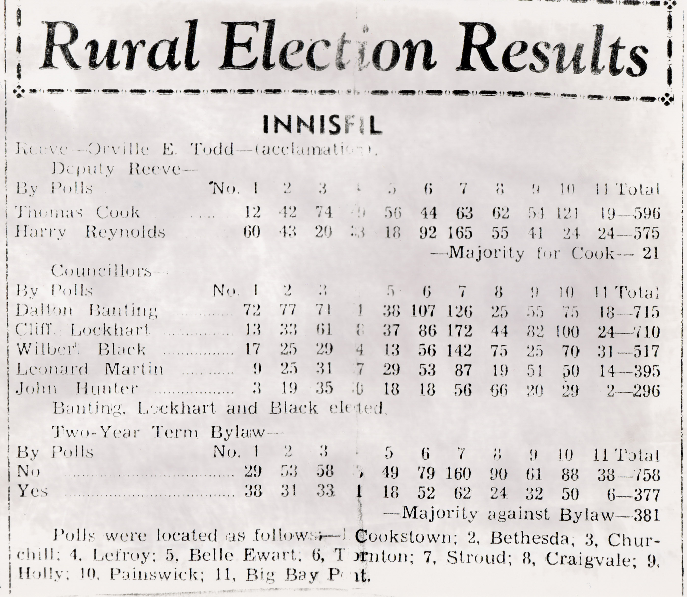 A scan of a newspaper clipping from the Barrie Examiner reporting the Rural Election Results in each of the 11 polling stations in Innisfil, date unknown.