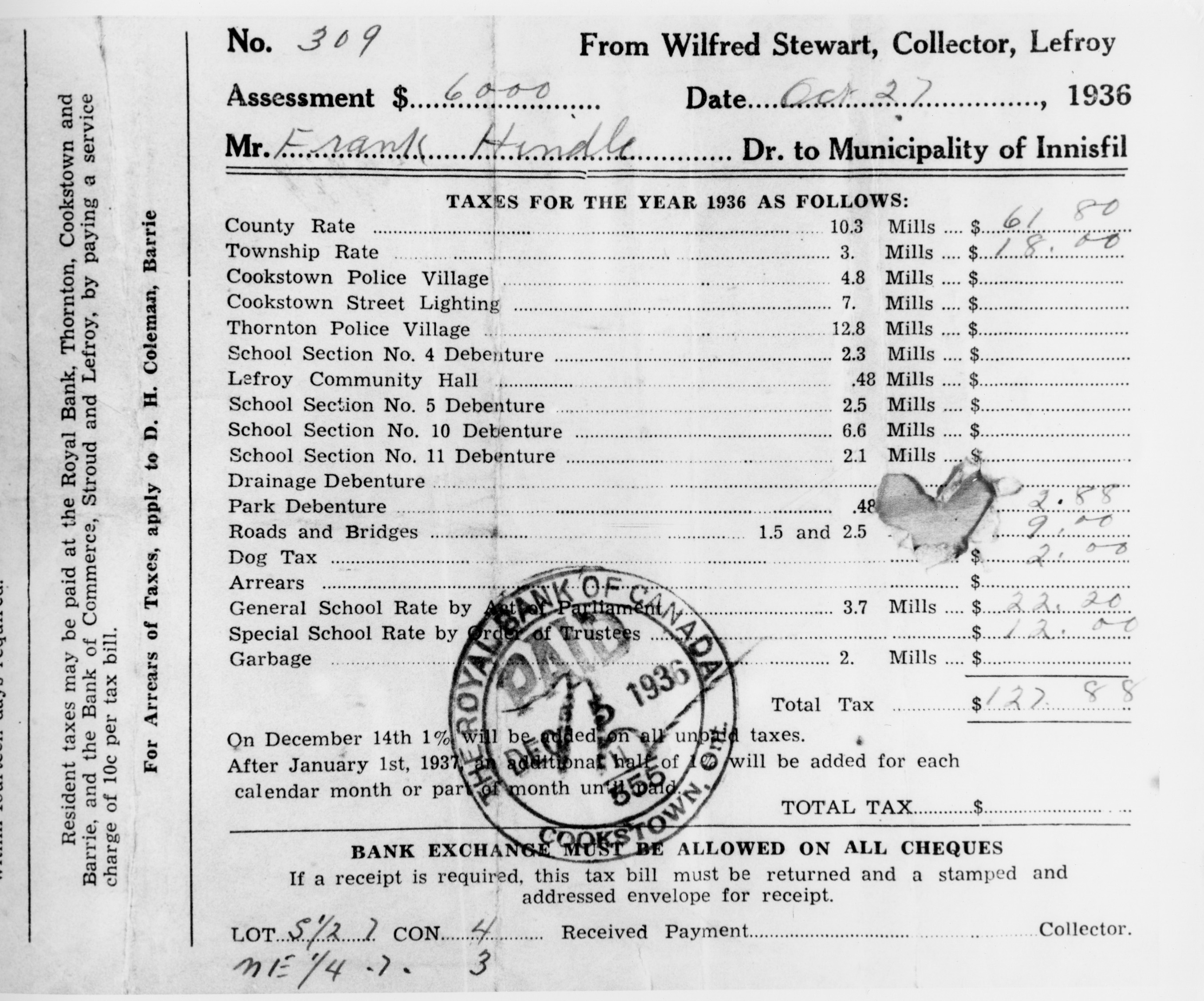 Tax bill from Innisfil township issued to Frank Hindle in the amount of $127.88 for 150 acres. The bill dates to 27 October 1936 and bears a stamp from the Royal Bank of Canada, Cookstown Ontario, dating to 5 December 1936.
