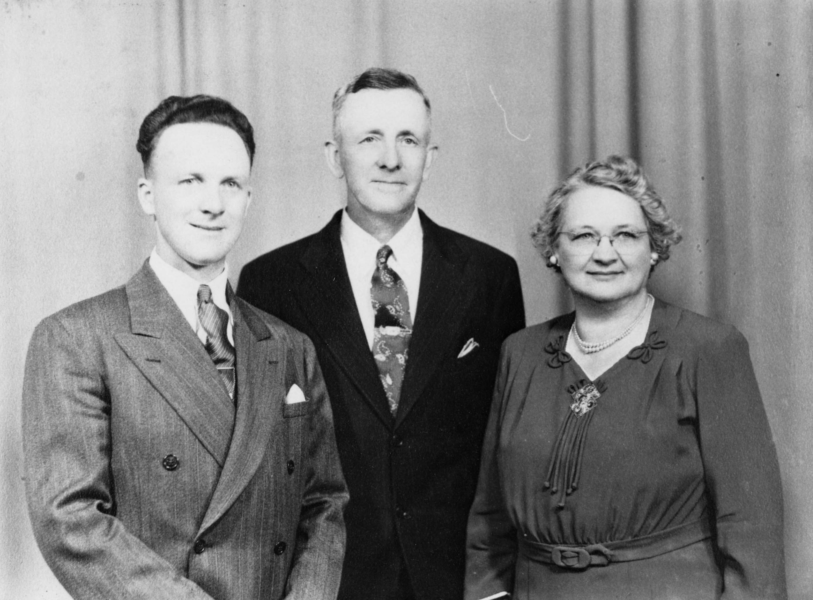 Studio portrait of Ross Harold Hubbert with his father William and mother Vida Hubbert (née Gill). Both men are dressed in suits and ties while Mrs. Hubbert is wearing a long dress, pearls, and glasses. William and Vida were married on 2 October 1918, and this photograph was taken the day before Mr. Ross Hubbert married Sarah Beryl (née Coutts). Ross and Sarah had three children named Donald, Cheryl, and Brant.