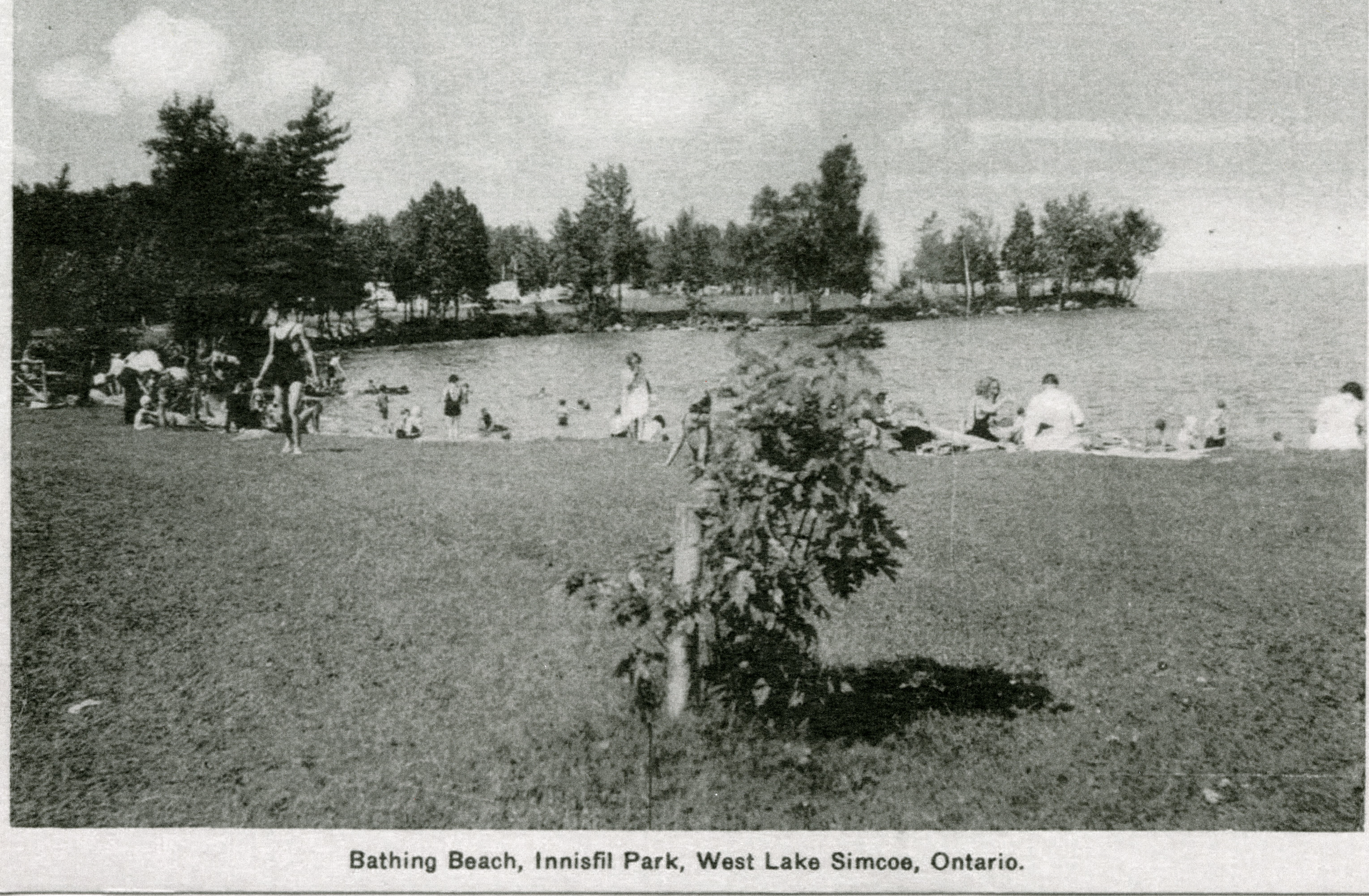 Black and White Photo of Bathing Beach at Innisfil Park (Now known as Innisfil Beach Park). The photo shows several people relaxing and swimming on a summer day at the beach and there are many trees in the background. The photo, is likely a scan of a postcard, has a caption that reads: "Bathing Beach, Innisfil Park, West Lake Simcoe, Ontario."
