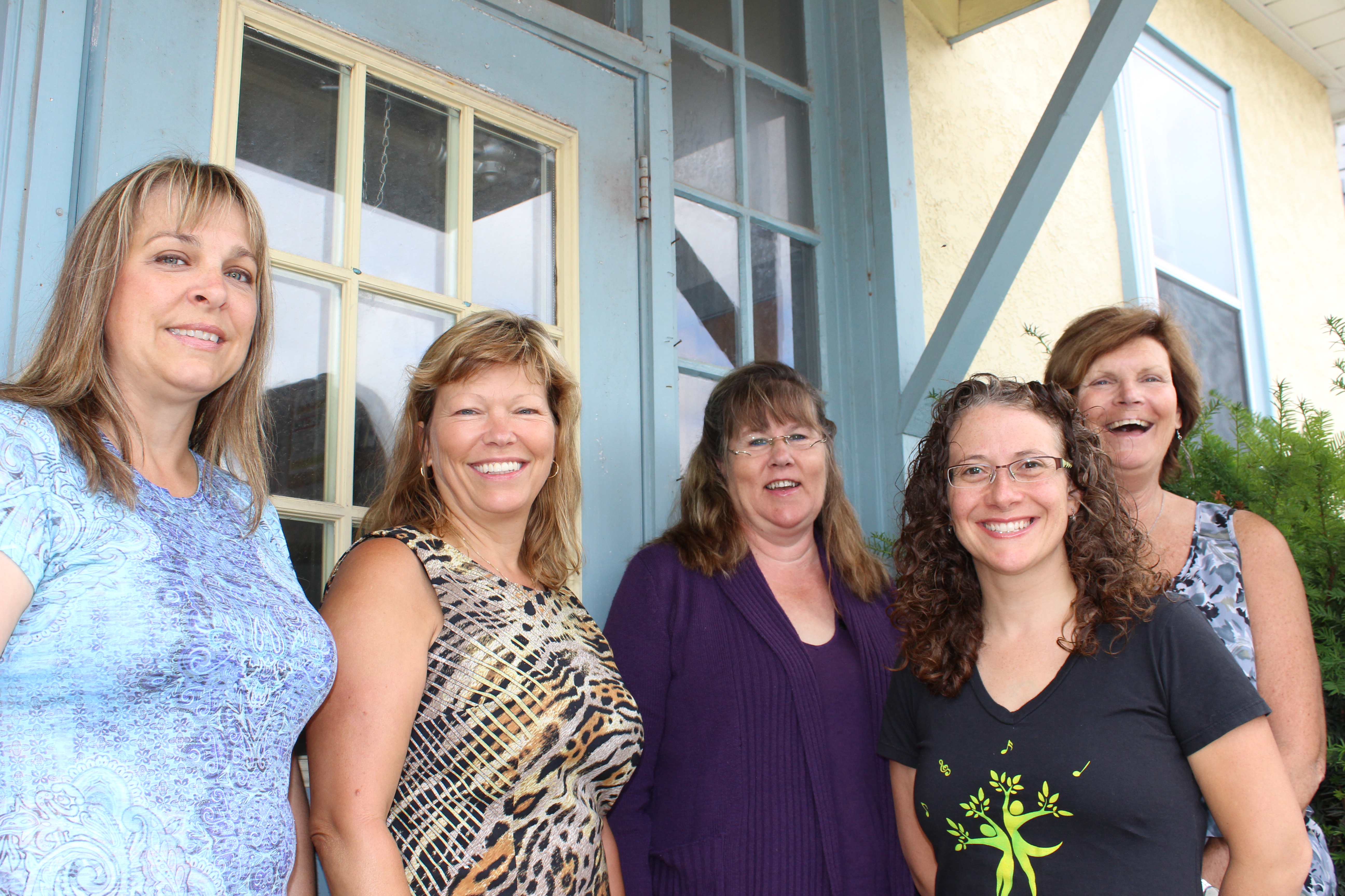 Photograph of the members of the Cookstown Chamber of Commerce standing on a front step. From left to right they are Lynn, Linda, Diana, Pam, and Wendy. This photo was taken as a part of the Faces of Innisfil project.