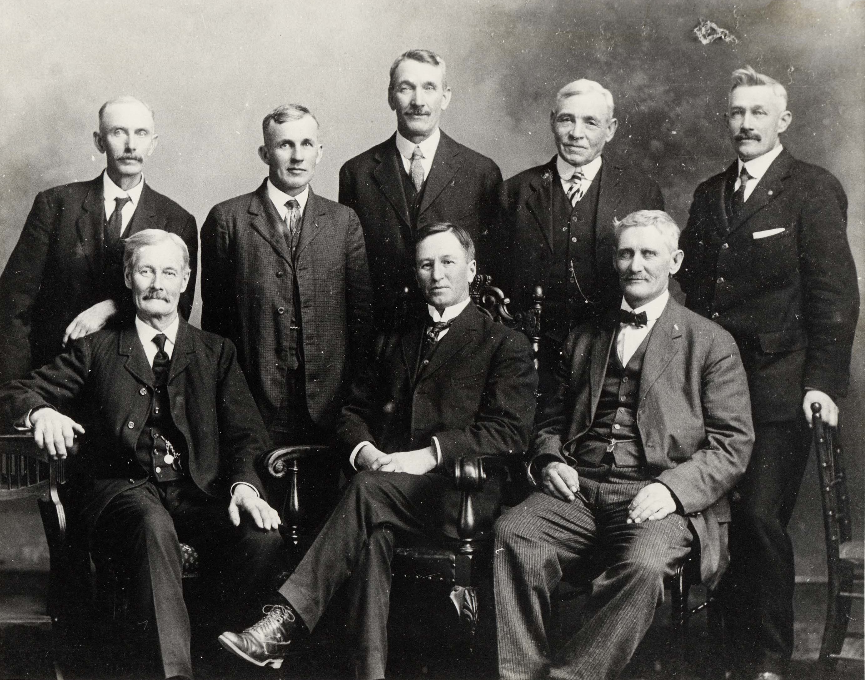 Group studio photo of the Innisfil Town Council from 1919. Pictured from left to right, seated in the front row are: James Black (Treasurer), Eben Todd (Reeve), and William Martin (Councillor). Standing in the back row are: W. B. Sloan (Tax Collector), D. H. Coleman (Deputy Reeve), George Leslie (Councillor), R. M. McConkey (Clerk), and G. C. Allan (Councillor). All of the men are dressed formally in suits and ties.