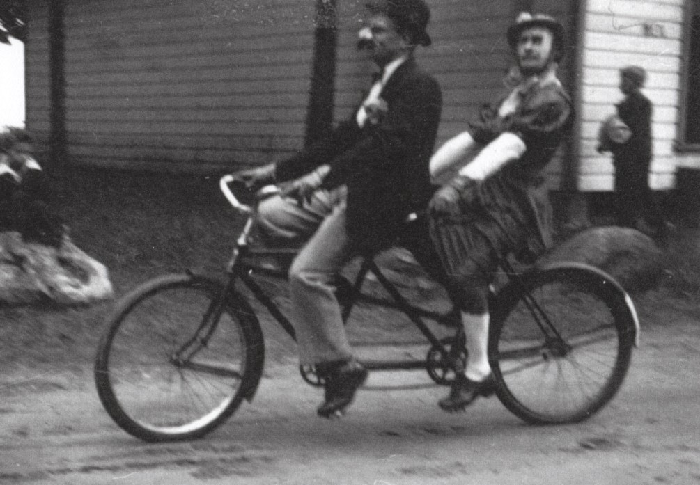 Photo of a bicycle built for two, which was an entry in the July 1951 Innisfil Township Centennial celebrations held at Innisfil Beach Park. Pictured on the bicycle in centennial costumes are Bruce Wice (dressed as "the gentleman" in a top hat) and Tom Bowman Sr. (dressed as "the lady" in a long dress and cap), who won a prize for their efforts. Bruce drove to Wasaga Beach to rent the bike and his 9 year old son Mervin accompanied him while returning the bike.