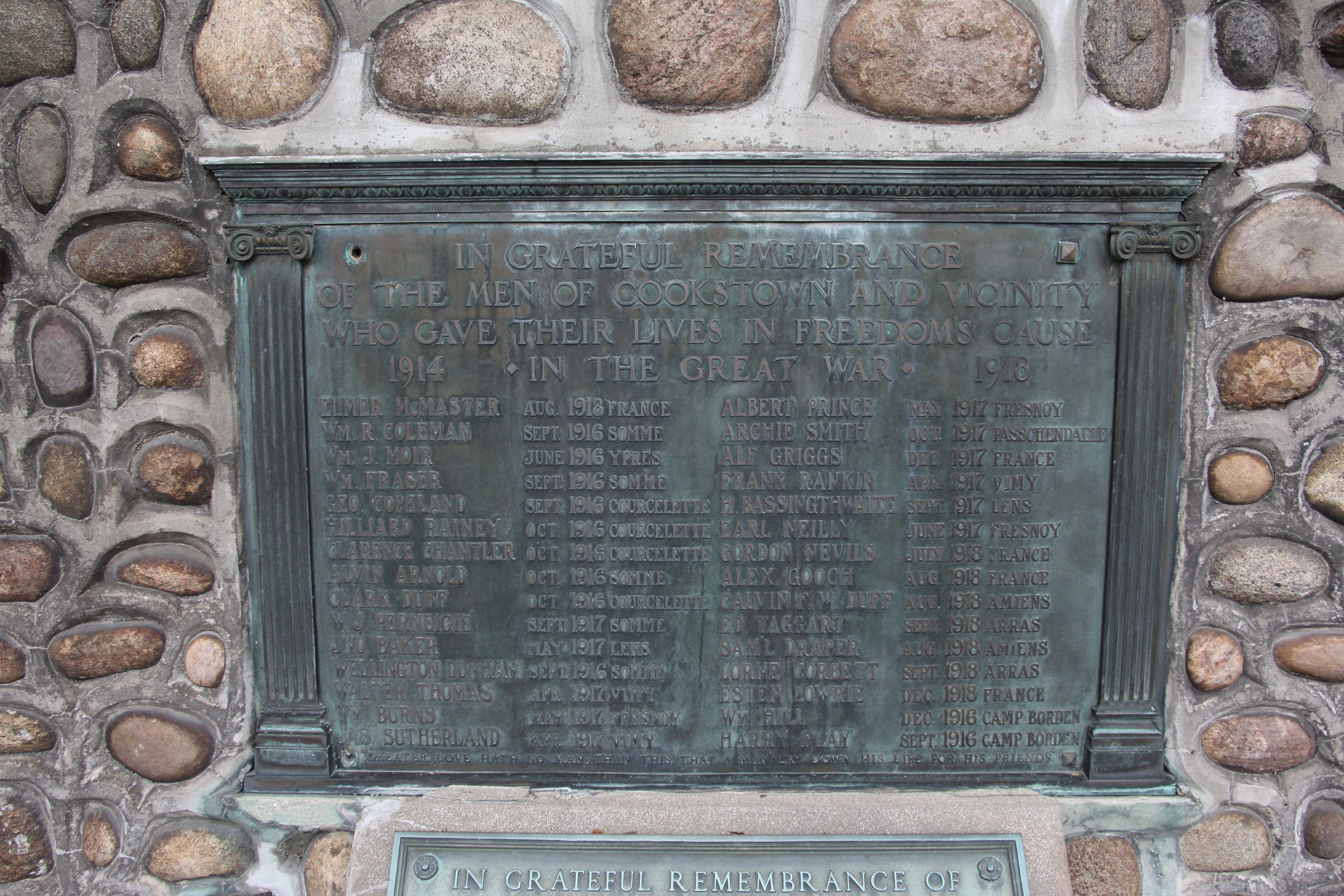 Bronze plaque mounted on the Cookstown cenotaph in honour of those who died in the first World War between 1914 and 1918. The inscription reads: "In grateful remembrance of the men of Cookstown and vicinity who gave their lives in freedom's cause in the Great War 1914-1918 -- Elmer McMaster Aug. 1918 France; Wm. R. Coleman Sept. 1916 Somme; Wm. J. Moir June 1916 Ypres; Wm. Fraser Sept. 1916 Somme; Geo. Copeland Sept. 1916 Courcelette; Hilliard Rainey Oct. 1916 Courcelette; Clarence Chantler Oct. 1916 Courcelette; Alvin Arnold Oct. 1916 Somme; Clark Duff Oct. 1916 Courcelette; W.J. Perneigie Sept. 1917 Somme; JNO Baker May 1917 Lens; Wellington Dunham Sept. 1916 Somme; Walter Thomas Apr. 1917 Vimy; Wm. Burns May 1917 Fresnoy; Jas. Sutherland Apr. 1917 Vimy; Albert Prince May 1917 Fresnoy; Archie Smith Oct. 1917 Passchendaele; Alf. Griggs Dec. 1917 France; Frank Rankin Apr. 1917 Vimy; H. Bassingthwaite Sept. 1917 Lens; Earl Neilly June 1917 Fresnoy; Gordon Nevils July 1918 France; Alex Gooch Aug. 1918 France; Calvin F.W. Duff Aug. 1918 Amiens; Ed. Taggart Sept. 1918 Arras; Sam L. Draper Aug. 1918 Amiens; Lorne Corbett Sept. 1918 Arras; Esten Lowrie Dec. 1918 France; Wm. Hill Dec. 1916 Camp Borden -- Greater Love Hath No Man Than This, That A Man Lay Down His Life For His Friends"