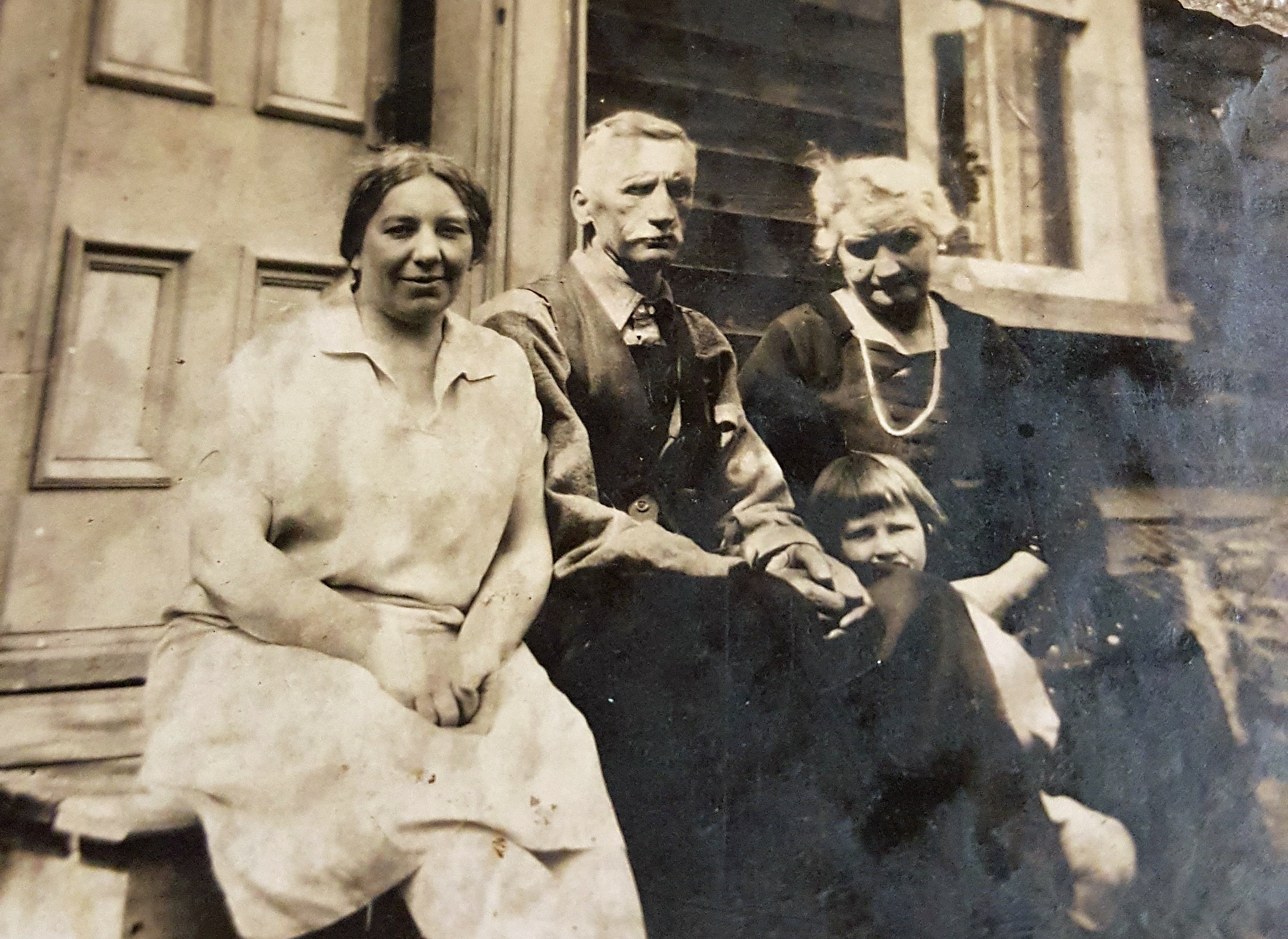 Photograph believed to be taken about 1932-33 at Painswick, at the home of Bob Warnica on Big Bay Point Rd. Pictured from left to right are: Jean Loudon (Mrs. William Robert Warnica, b. 28 August 1884, d. 13 May 1964), William Robert "'Bob" Warnica (b. 22 December 1865, d. 22 September 1939), Maude "Gertrude" Warnica (Mrs. Harvey Herbert Quantz, sister of Bob Warnica, b. 1 December 1867, d. 22 October 1944), and the child is Shirley Gertrude Davey, granddaughter of Maude "Gertrude" Warnica and Harvey Herbert Quantz, and daughter of Edward Davey and Minerva "Minnie" Gertrude Quantz (born May Gertrude Quantz). This item was donated by Bill Warnica on 9 February 2017 courtesy of Shirley Kelly (née Davey).