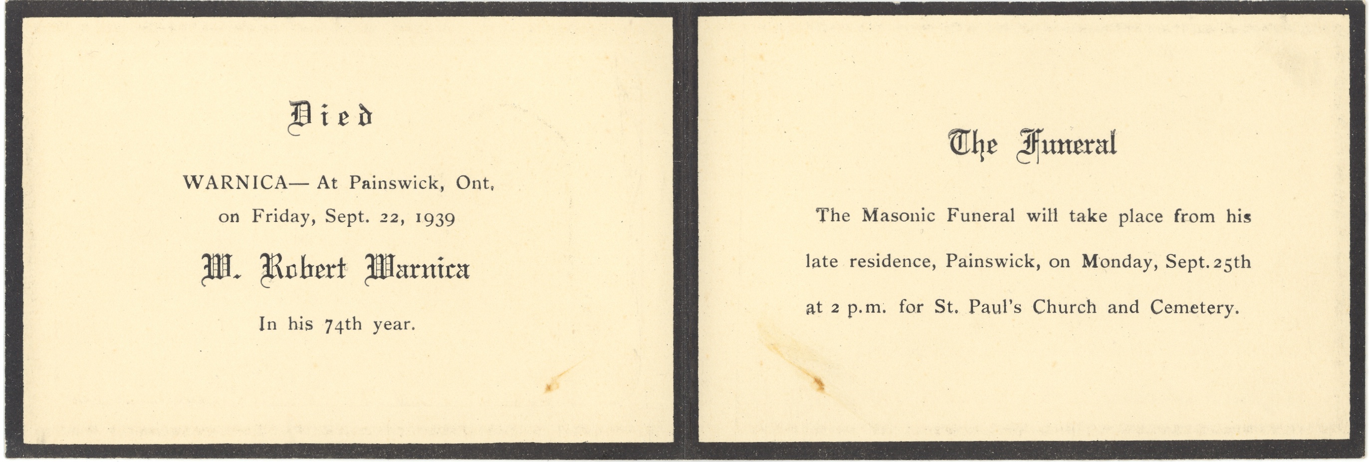 Copy of the memorial card issued for William Robert "Bob" Warnica. The text reads: "Died Warnica - at Painswick, ONt, on Friday, Sept. 22, 1939 W. Robert Warnica In his 74th year. The Funeral: The Masonic Funeral will take place from his late residence, Painswick, on Monday, Sept. 25th at 2 p.m. for St. Paul's Church and Cemetery." Bob (22 December 1865 - 22 September 1939) was married to Jean Warnica (née Loudon, 28 August 1884 - 13 May 1964) and lived in the house built by his father, Hanning Warnica in Painswick.