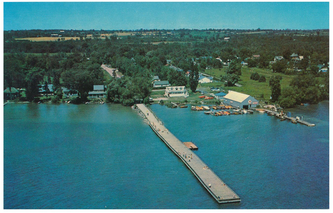 Aerial colour photo of the pier at Belle Ewart. Visible at the far right of the photo is the stern of the Emily May, which was abandoned and left to rot just under the trees. The pier in 2017 is approximately half the length that it is in this photo. Construction to shorten the pier is believed to have started in 1958/59 and completed in the early 1960s.