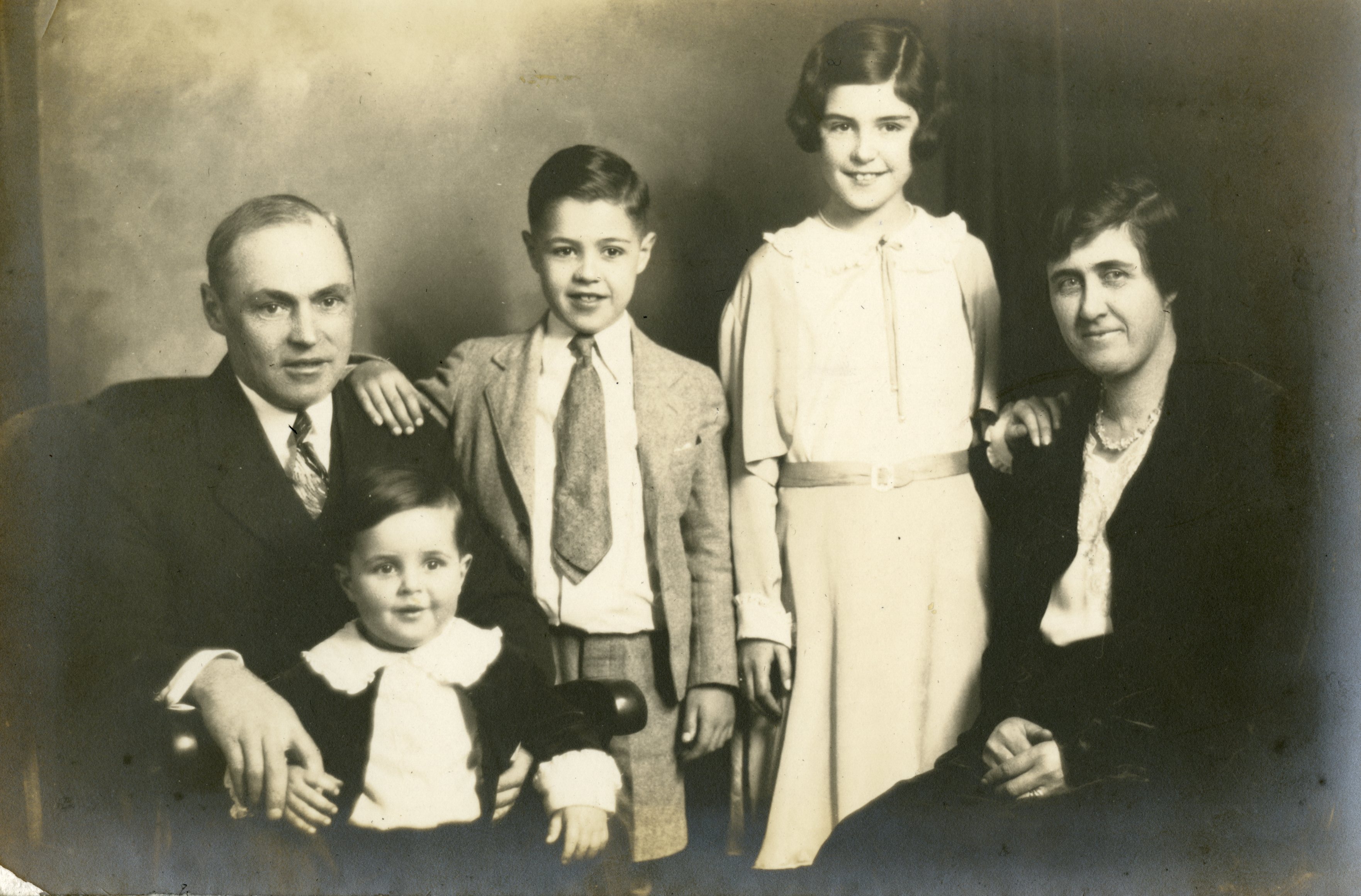 Family portrait of William Earl Rowe holding his son Howard Lennox (known as Lennox), with his elder son William "Bill" standing next to him. Beside Bill is Earl's daughter Jean, standing next to his wife Treva (née Lennox). During his political career, Earl Rowe served as reeve of the township of West Gwillimbury from 1919 to 1923. Rowe served as a Member of Provincial Parliament from 1923 to 1925, and was then elected to the House of Commons, where he served until 1935. From 1936 to 1938, he was leader of Conservative Party of Ontario though, as he did not have a seat in the legislature George S. Henry remained Leader of the Opposition. He also served as Ontario's twentieth lieutenant governor from 1963 to 1968. His daughter, Jean Casselman Wadds was also a Member of Parliament and from 1958 to 1962 Earl and Jean were the only father and daughter to sit together in parliament. Jean Casselman Wadds also served as Canadian High Commissioner to the United Kingdom from 1979 to 1983, playing a role in the government of Pierre Trudeau's negotiations with the British government of Margaret Thatcher in Trudeau's successful effort to patriate the Canadian Constitution in 1982. The Rowe family lived on a farm in Newton Robinson, and Treva remained close with Wilhelmina "Mina" Henderson, whom the family had hired to help with running the household from 1928/9 until 1932. This photo was sent to Mina long after her departure from the family farm and was donated by Mina's daughter, Elizabeth Carson.