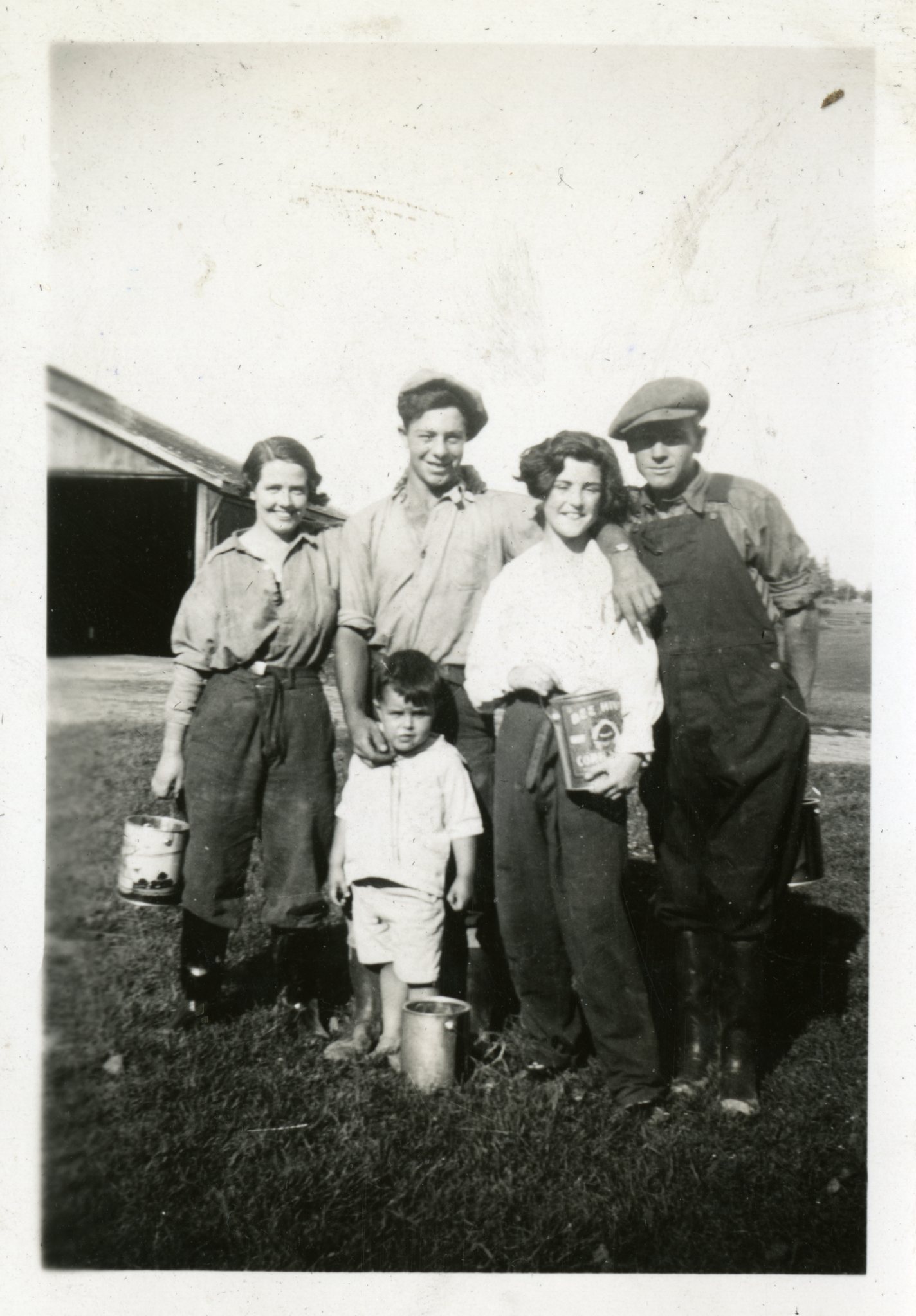 Photo of Wilhelmina "Mina" Henderson (left) and Jean Rowe (later Jean Casselman Wadds, second from right) picking berries in 1932 with two young men and a little boy, likely Jean's youngest brother Lennox. Both girls are dressed in loose blouses and pants with pails at their feet, and the boys are wearing newsboy caps. Jean was the daughter of William Earl Rowe. During his political career, Earl Rowe served as reeve of the township of West Gwillimbury from 1919 to 1923. Rowe served as a Member of Provincial Parliament from 1923 to 1925, and was then elected to the House of Commons, where he served until 1935. From 1936 to 1938, he was leader of Conservative Party of Ontario though, as he did not have a seat in the legislature George S. Henry remained Leader of the Opposition. He also served as Ontario's twentieth lieutenant governor from 1963 to 1968. His daughter Jean was also a Member of Parliament and from 1958 to 1962 Earl and Jean were the only father and daughter to sit together in parliament. Jean Casselman Wadds also served as Canadian High Commissioner to the United Kingdom from 1979 to 1983, playing a role in the government of Pierre Trudeau's negotiations with the British government of Margaret Thatcher in Trudeau's successful effort to patriate the Canadian Constitution in 1982. The Rowe family lived on a farm in Newton Robinson, and Earl's wife Treva remained close with Mina Henderson, whom the family had hired to help with running the household from 1928/9 until 1932. This photo was donated by Mina's daughter, Elizabeth Carson.