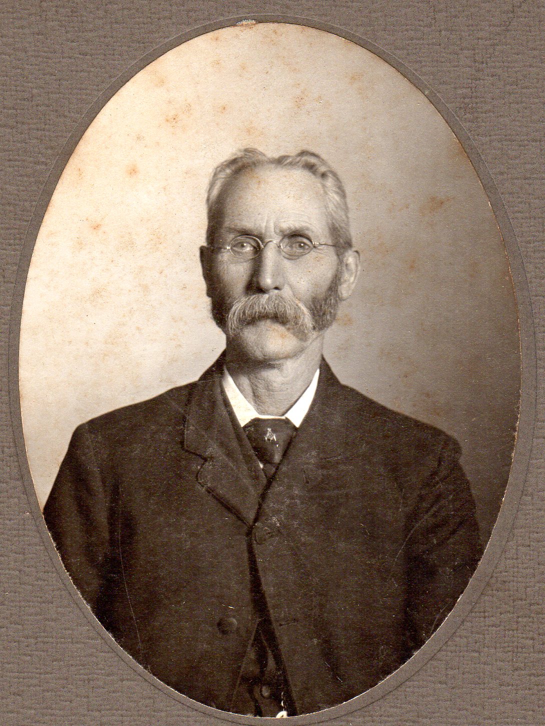 Studio portrait of George Frederic Hanning Warnica, known as Hanning, who was born on 23 November 1837 in Innisfil to parents William Daniel Warnica and Sarah Orchard. Hanning married Mary Anne Metcalf on 22 March 1865 and together they had seven children: William Robert, Maude Gertrude, Sarah Amelia Agnes, Hanning "Buff" Metcalf, Jessie Ada, Lucy May, and John Franklin. Hanning was a carpenter and barn builder, and he passed away at Painswick on 25 October 1915 and was interred at St. Paul's Cemetery.