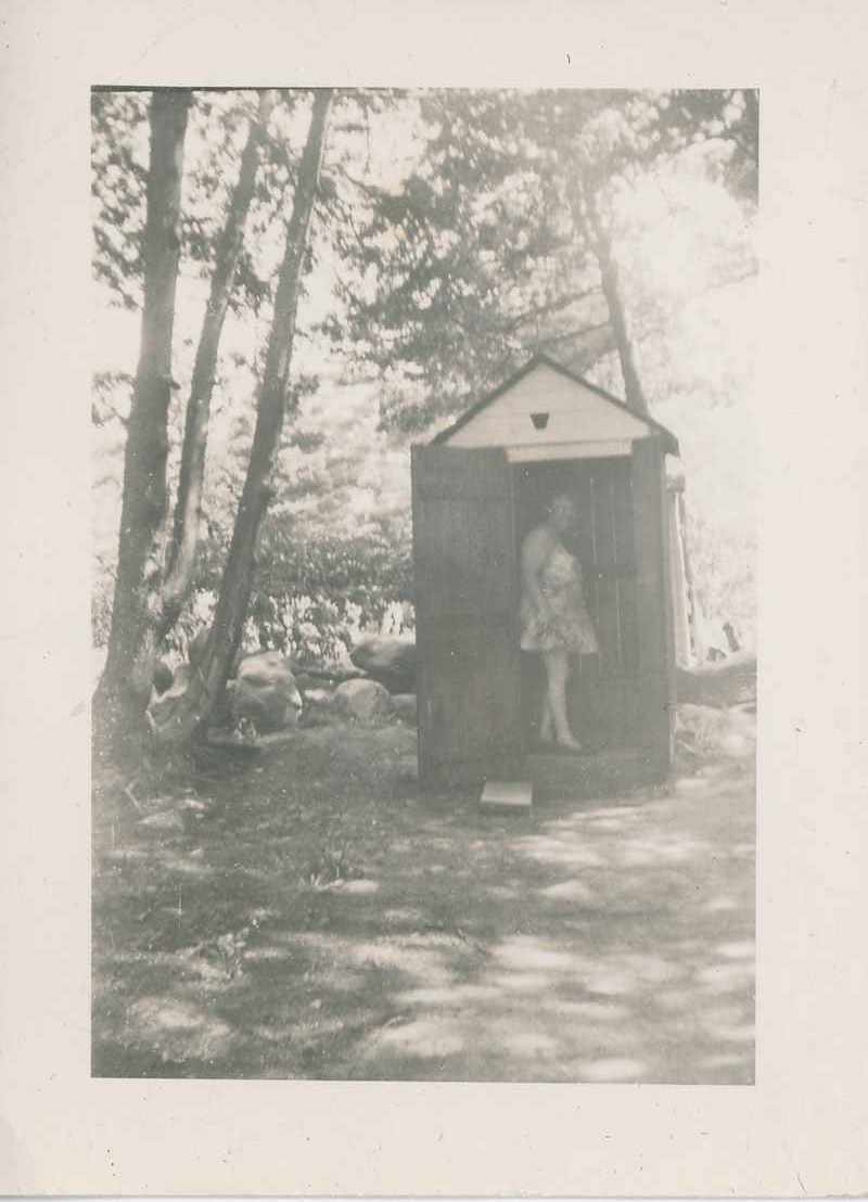 Photo of Nellie Nunn standing inside a "two-seater outhouse" at "Win Twin" cottage on the 25th Sideroad.