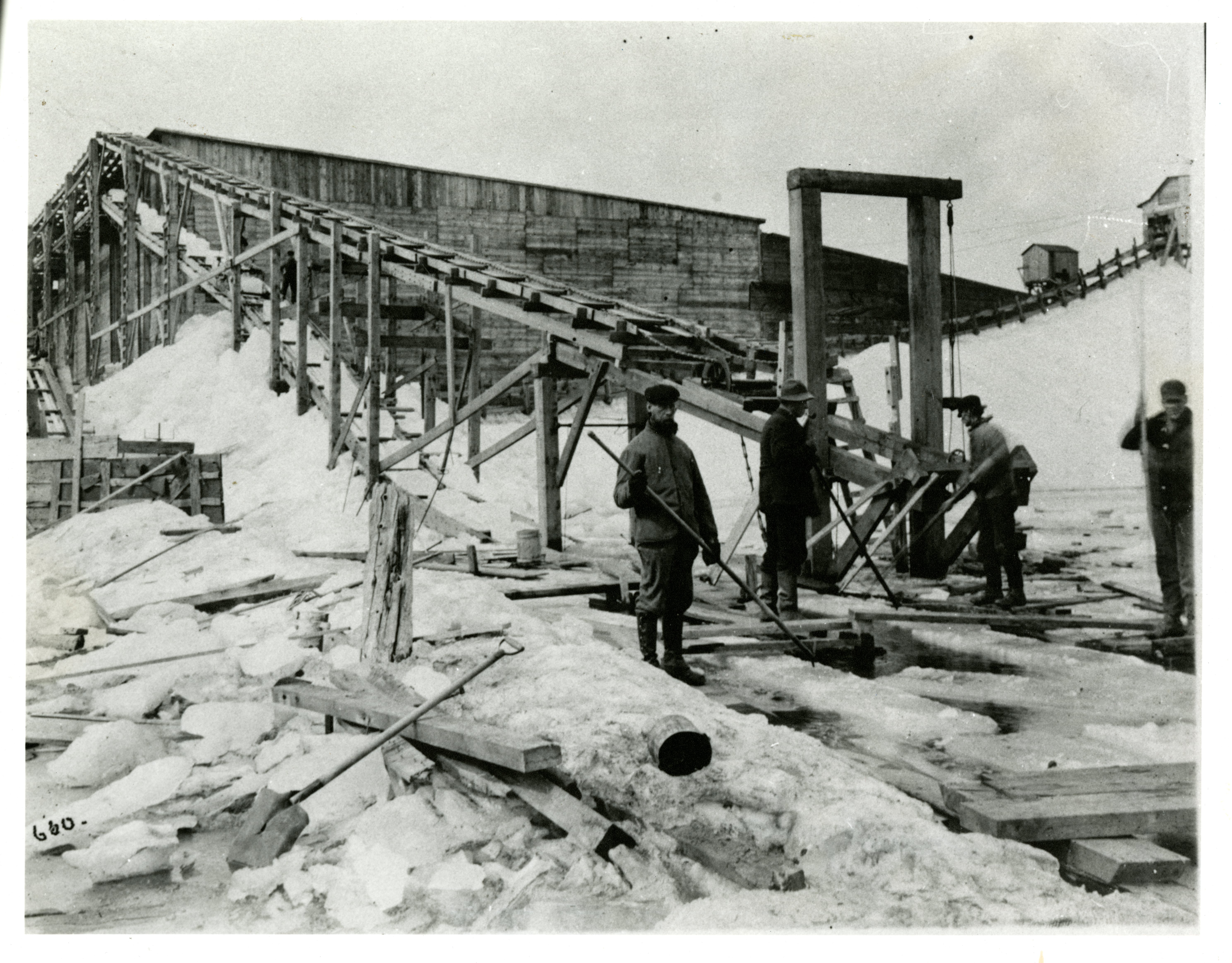 Photo of a group of men loading ice blocks from Lake Simcoe onto a conveyor for storage in a Belle Ewart Ice Company ice house, which used sawdust to preserve the ice through warm summer months. Lake Simcoe ice was shipped near and far for use in ice boxes before the advent of refrigerators, and had an esteemed reputation for purity.