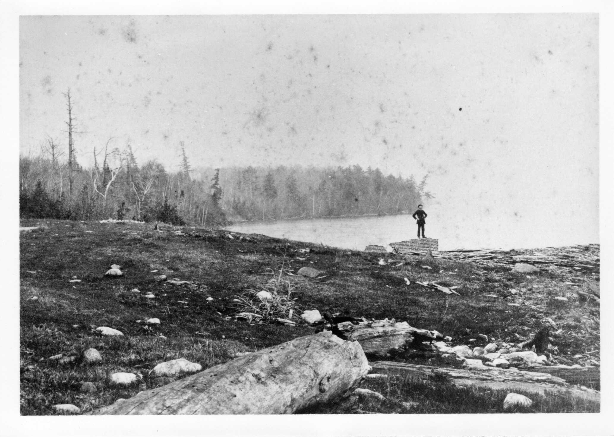 Photo of an unidentified man standing on the remnants of a brick wall located on the north half of lot 23, concession 13 of Innisfil by legal description. In actuality, this point of land extends into the 14th concession and presumably it was deemed unnecessary to create a new title for the less than a half an acre point of land into Kempenfelt Bay. This point of land has been called 'Mill Point' as it was once the location of a saw mill where logs were floated down for milling. It has also been called Hammond Point for John Hammond who owned the neighbouring property, as well as Metcalf's Point in 1881. If the photo had been taken with modern technology, the city of Barrie would be visible in the background, five miles over the man's left shoulder. The 3rd great grandfather of Bill Warnica, James Soules, died on this point of land when he froze to death in 1833. There is nothing on this point of land at present and is now known as 1130 Shoreview Drive and 1120 Shoreview Drive Innisfil. It is possible that the brick wall may have been a part of the old mill.